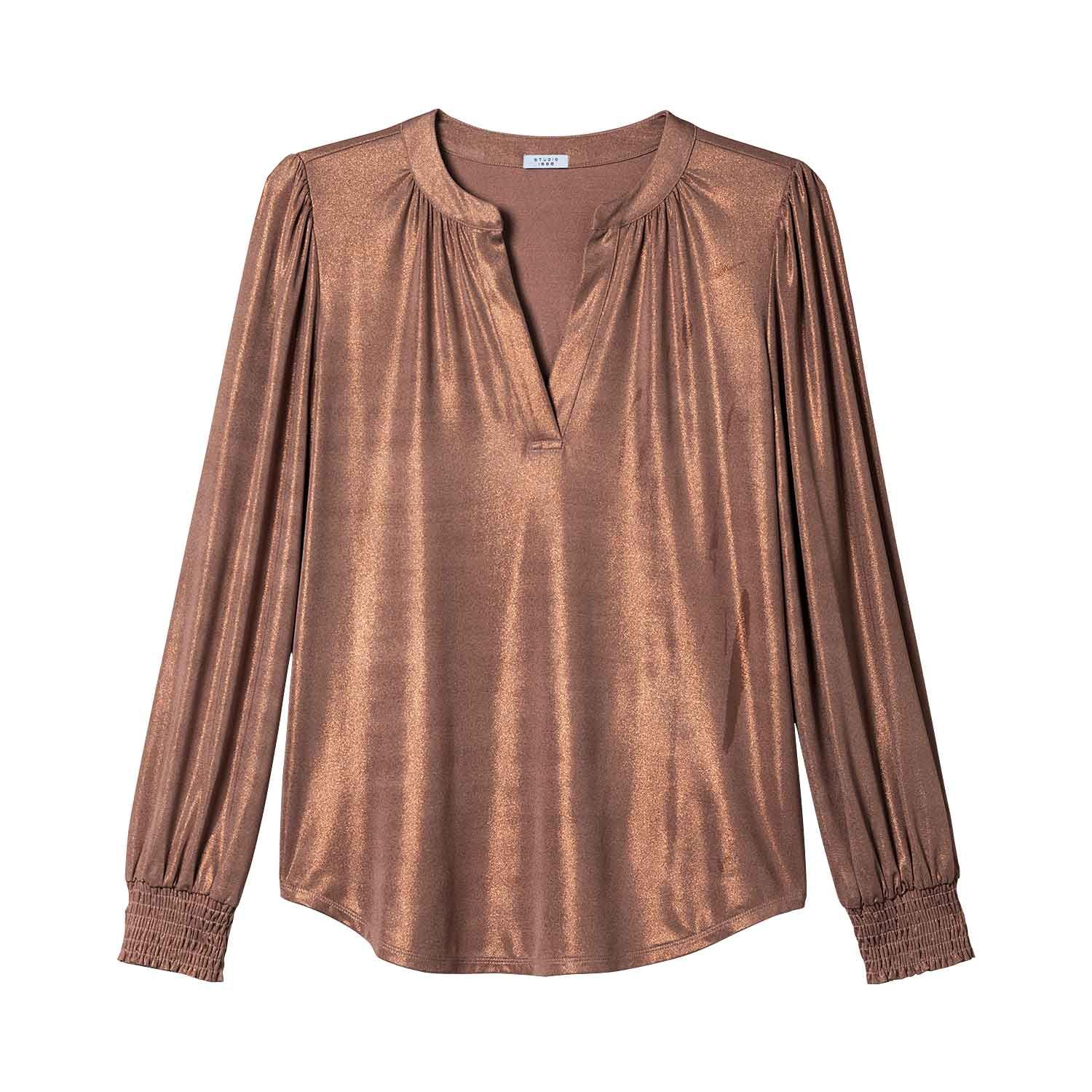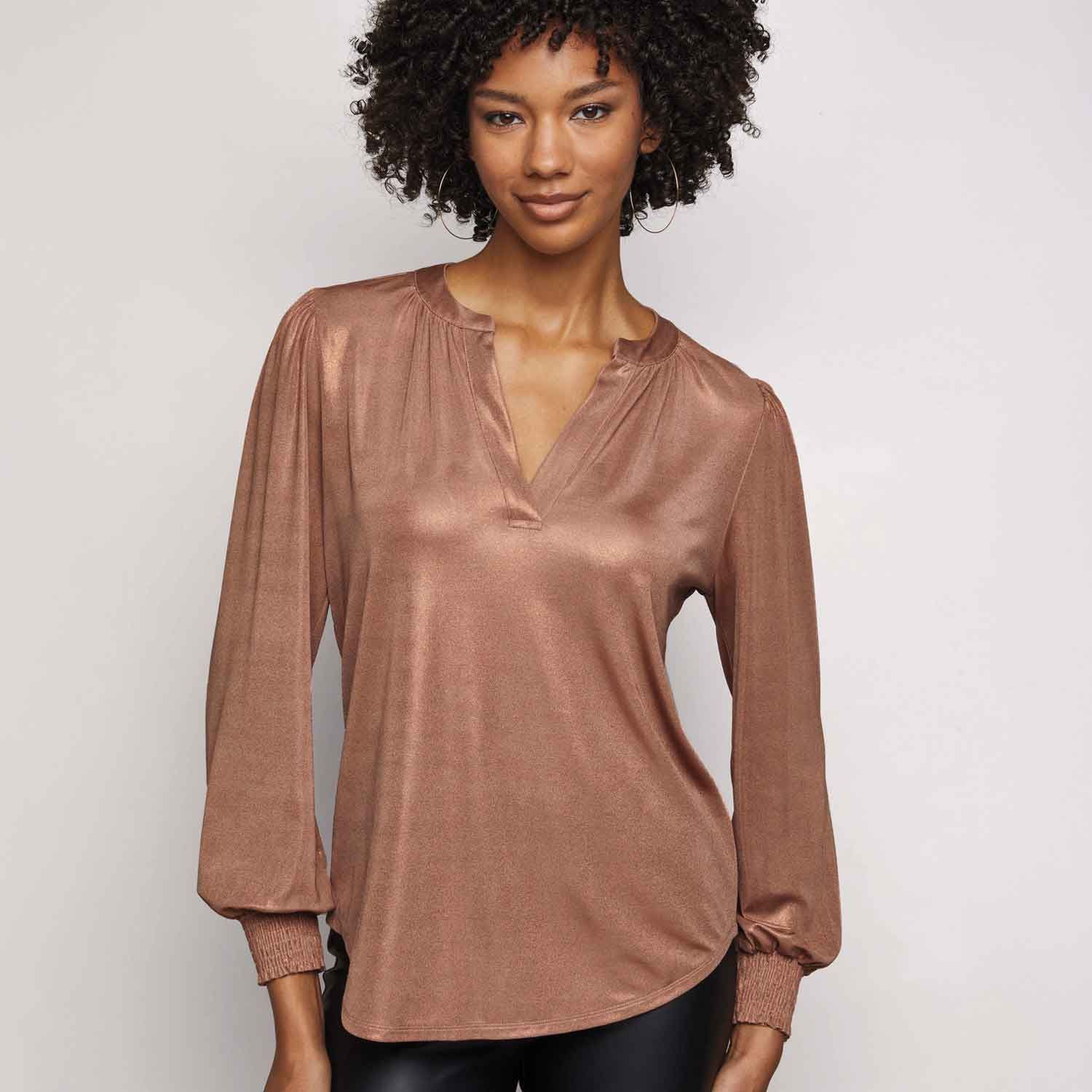 Let your dazzling sense of style shine through with this shimmering rose gold metallic blouse. Center back length: 25" on medium; 26" on 1X. Imported.