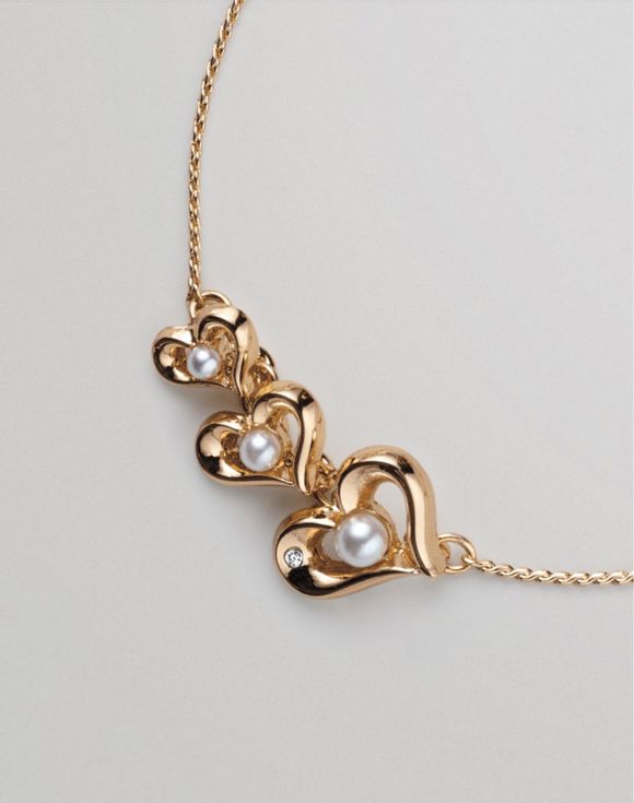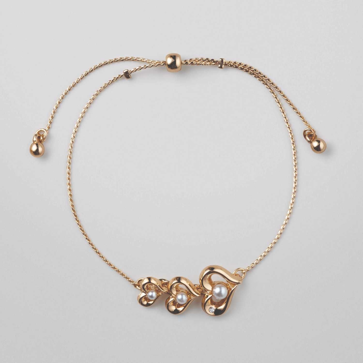 Make hearts flutter with the perfect romantic accessory. Goldtone hearts accented with pearly stones are set in a delicate goldtone chain. Matching necklace and ring also available.