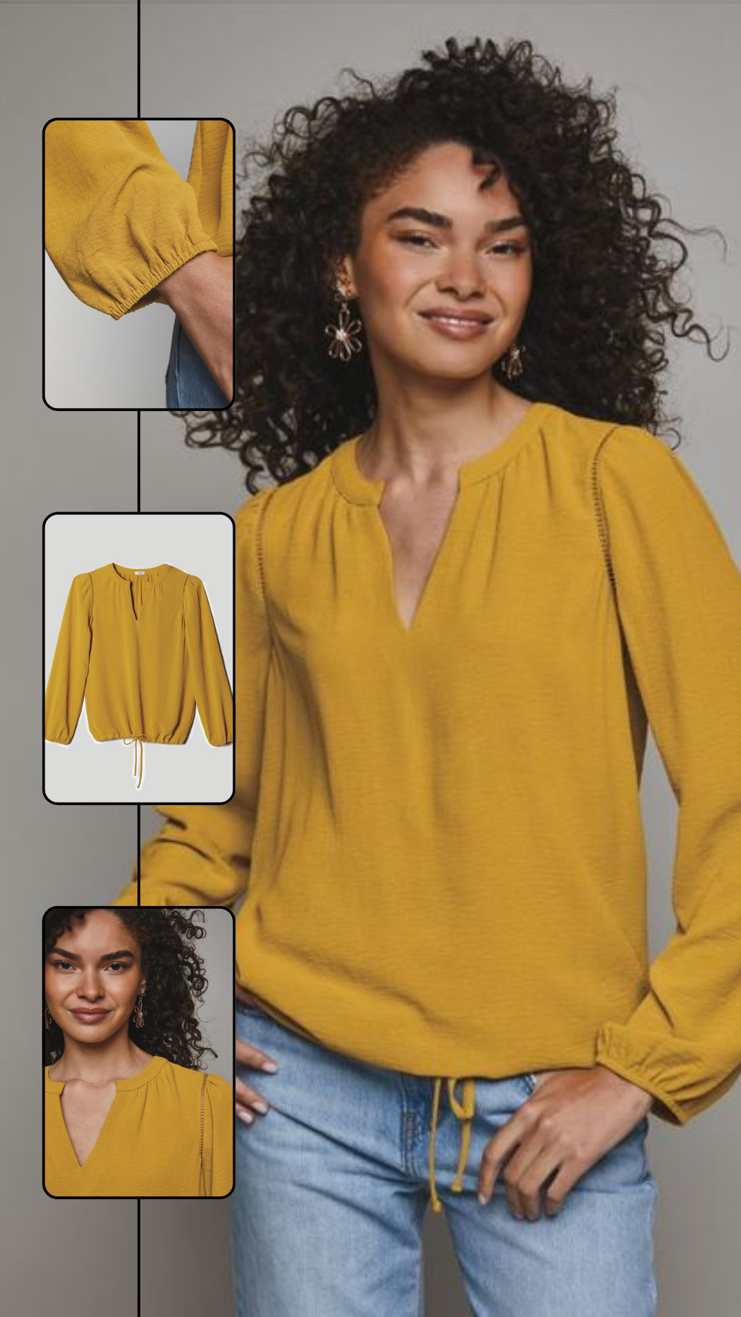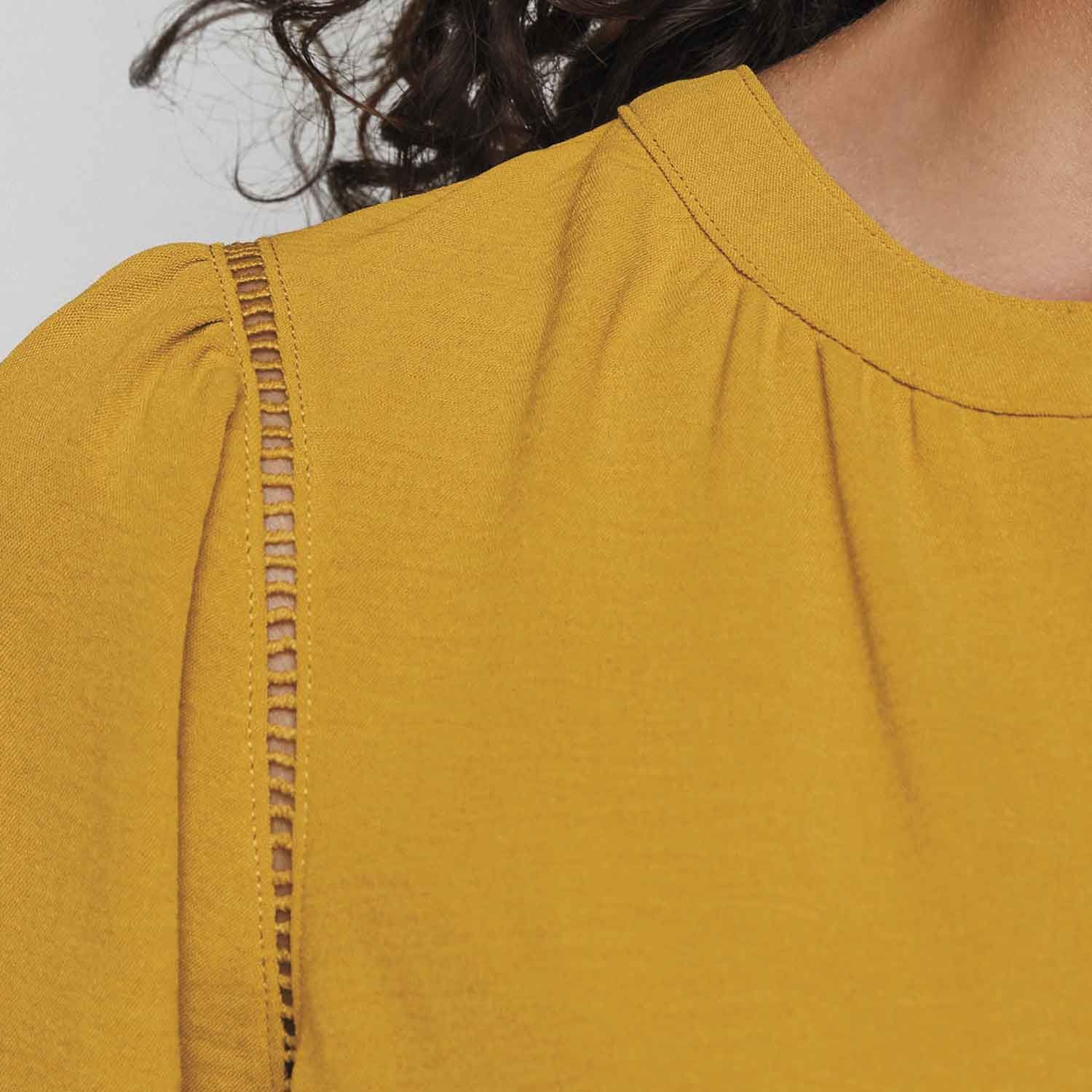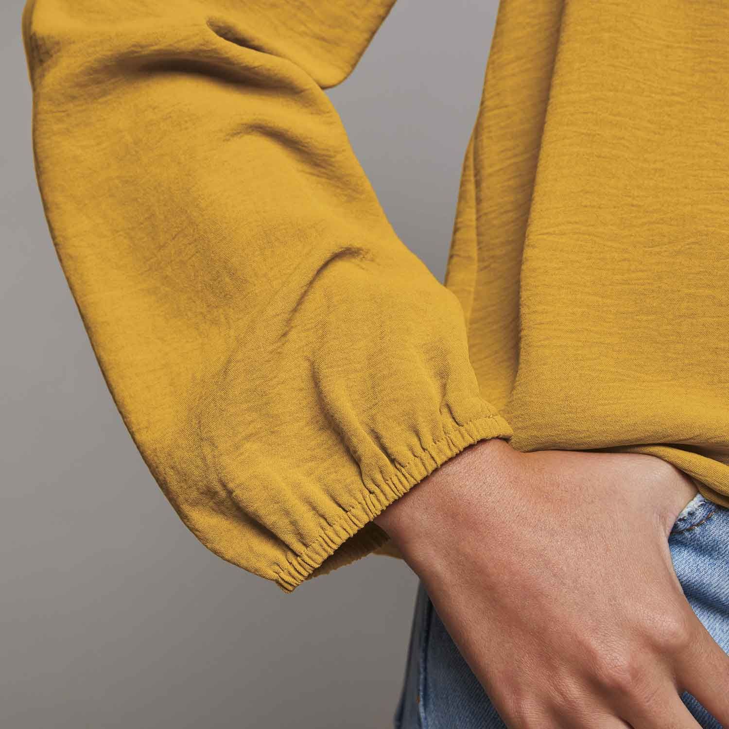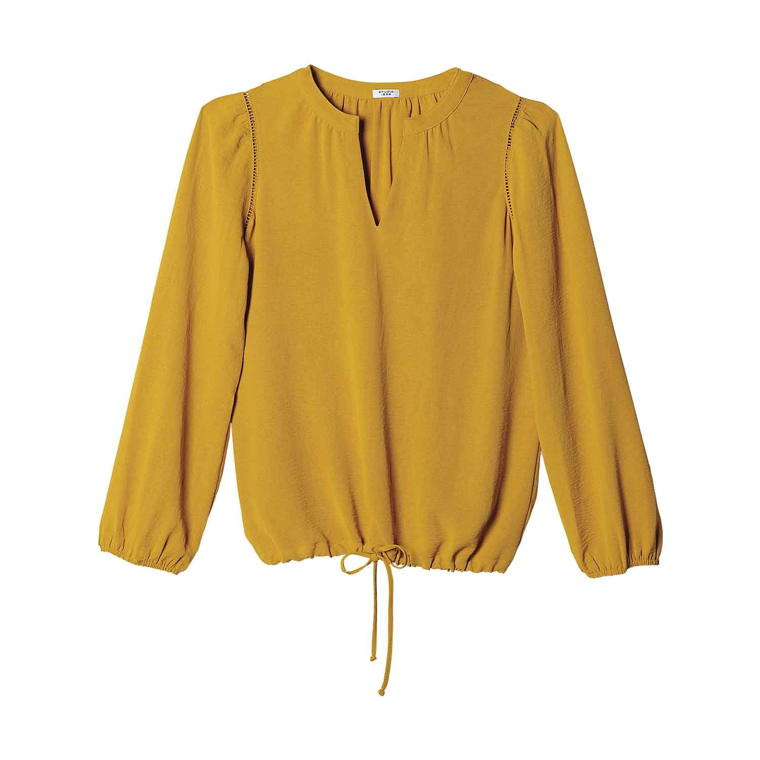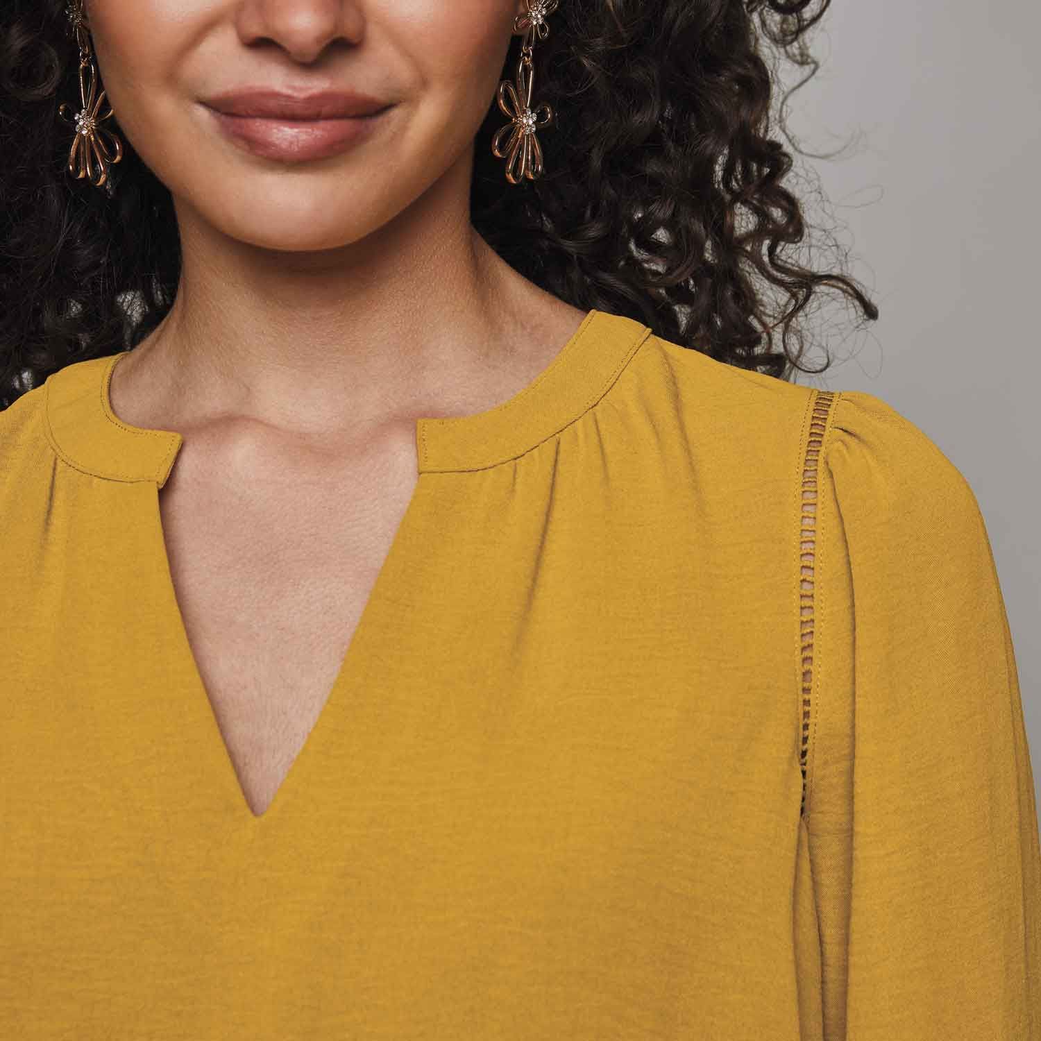 A lightweight, billowy blouse adds a hint of sunshine to your wardrobe. This beautiful golden yellow top has a V-neck, long sleeves with elastic cuff and drawstring at bottom hem for an adjustable fit. Finished with ladder lace trim at sleeve seams for a unique element. Center back length: 24" on M; 26" on 1X. Imported.