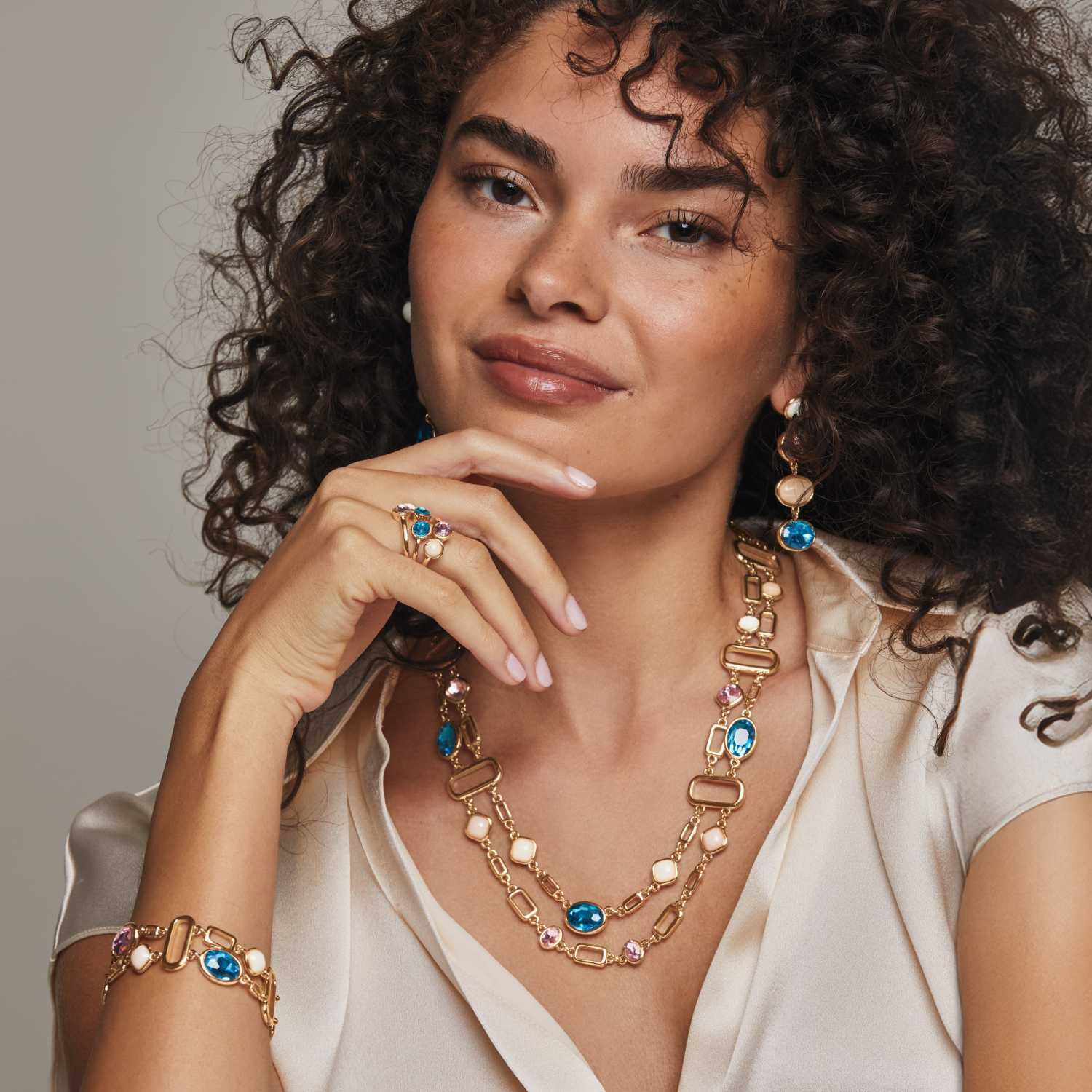Defined by its sculptural shape, this two-row chain necklace with an art deco-inspired design looks distinct and of-the-moment. Colored stones in mixed shapes set in goldtone adorn this modern classic. Matching ring, bracelet and earrings also available.