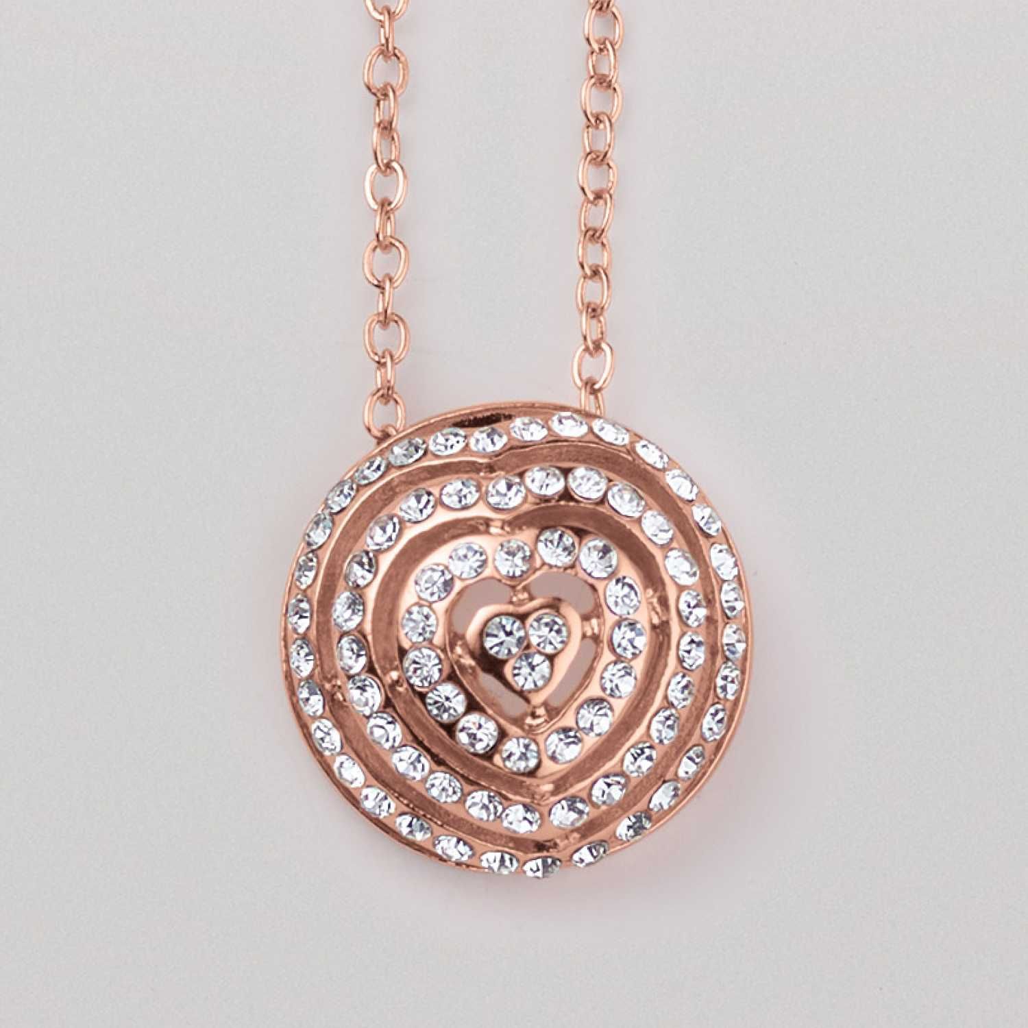 A symbolic reminder to lead with love anywhere you go. A rose goldtone pendant of concentric hearts is adorned with rows of gleaming pavé stones and a shimmering center heart.