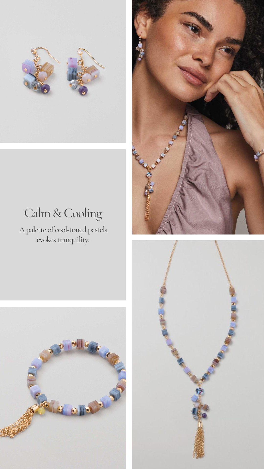 Accent your look with a combination of soothing pastel hues. Cool-tone and goldtone beads are layered with a goldtone chain tassel for a little extra flair. Matching necklace and earrings also available.