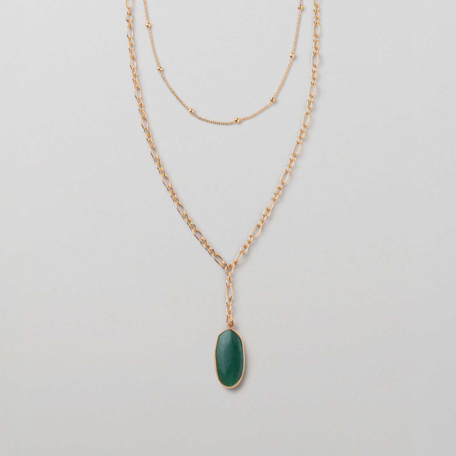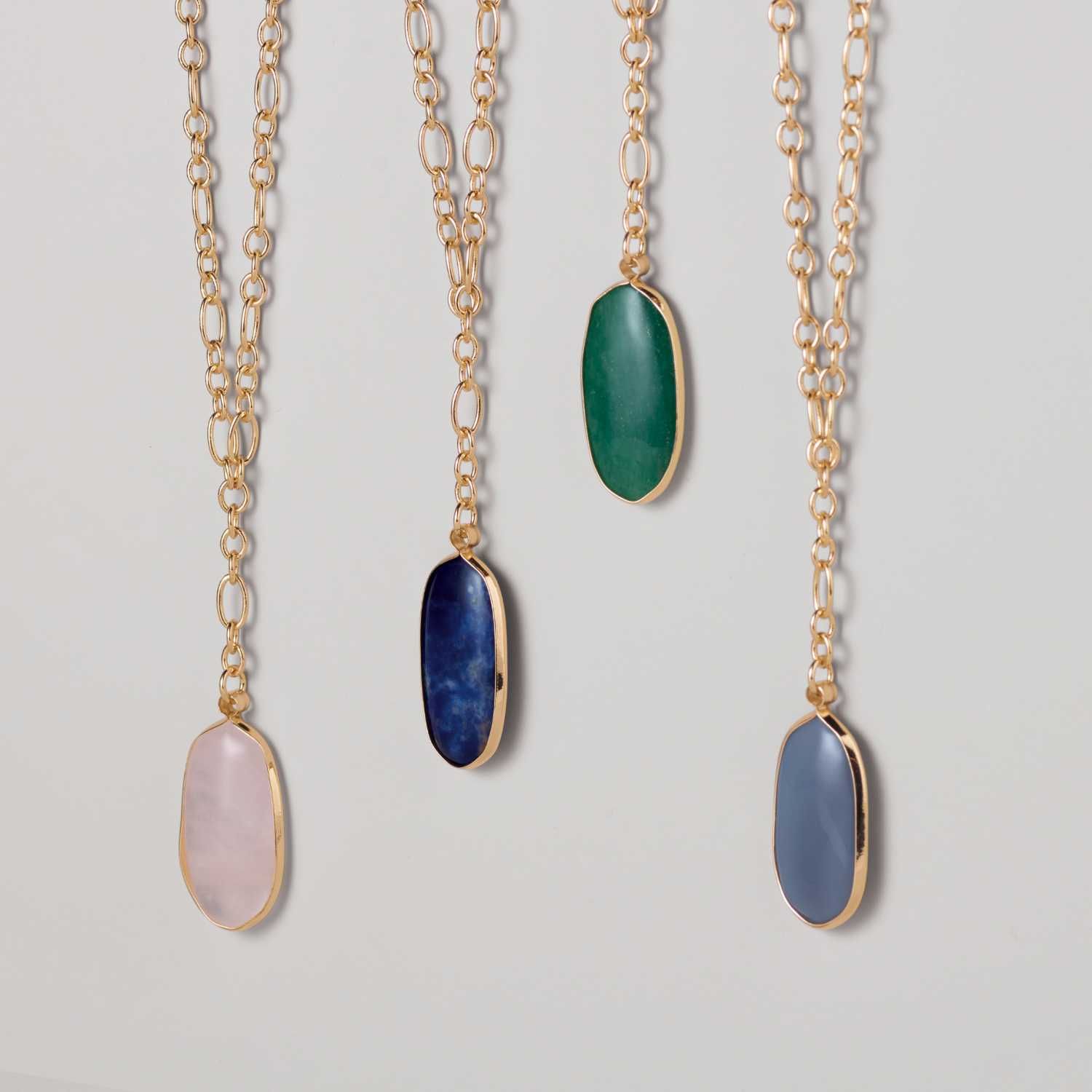 Harness the positive vibrations of semi-precious stones in a versatile layered pendant necklace. Choose from four styles: grey agate (known for increasing focus and stability), aventurine (known to boost confidence and luck), sodalite (known for promoting balance and harmony) and rose quartz (known as a symbol of compassion and love).