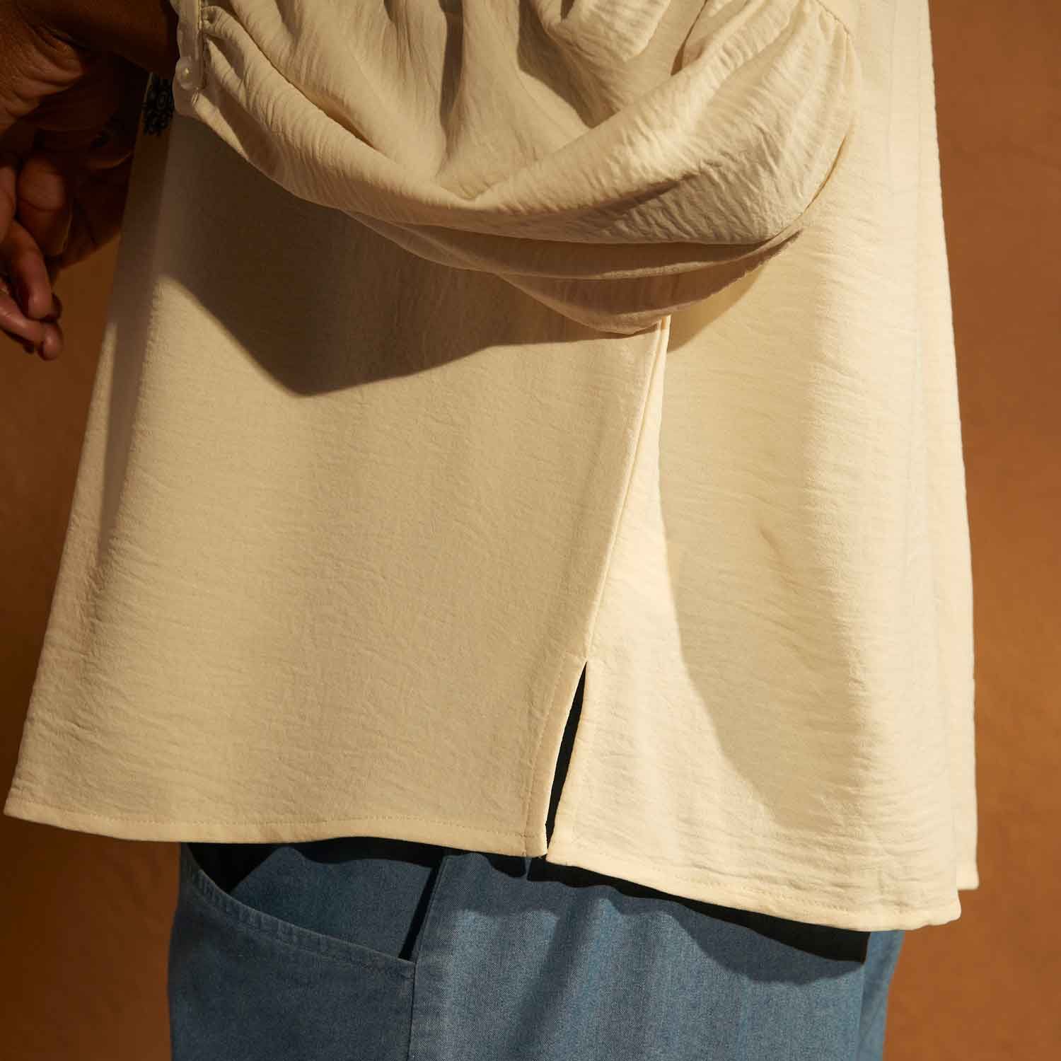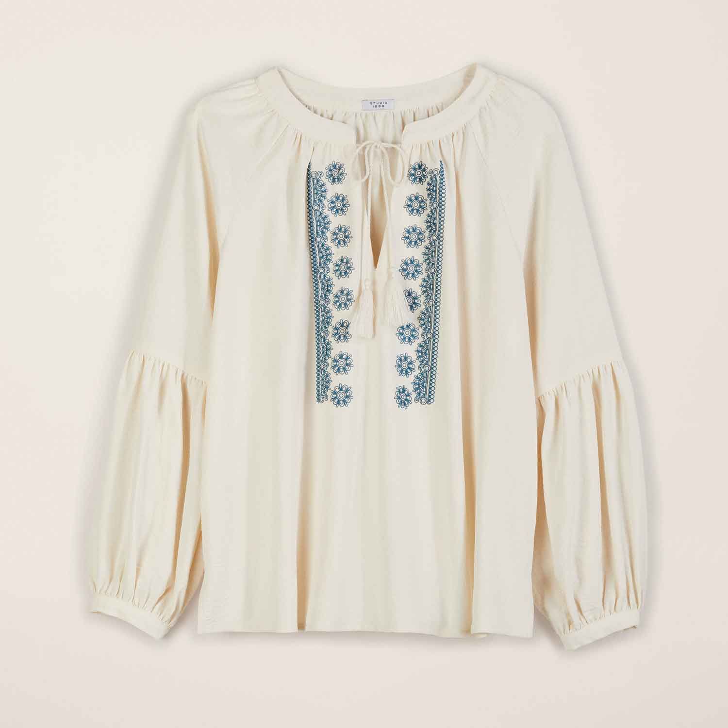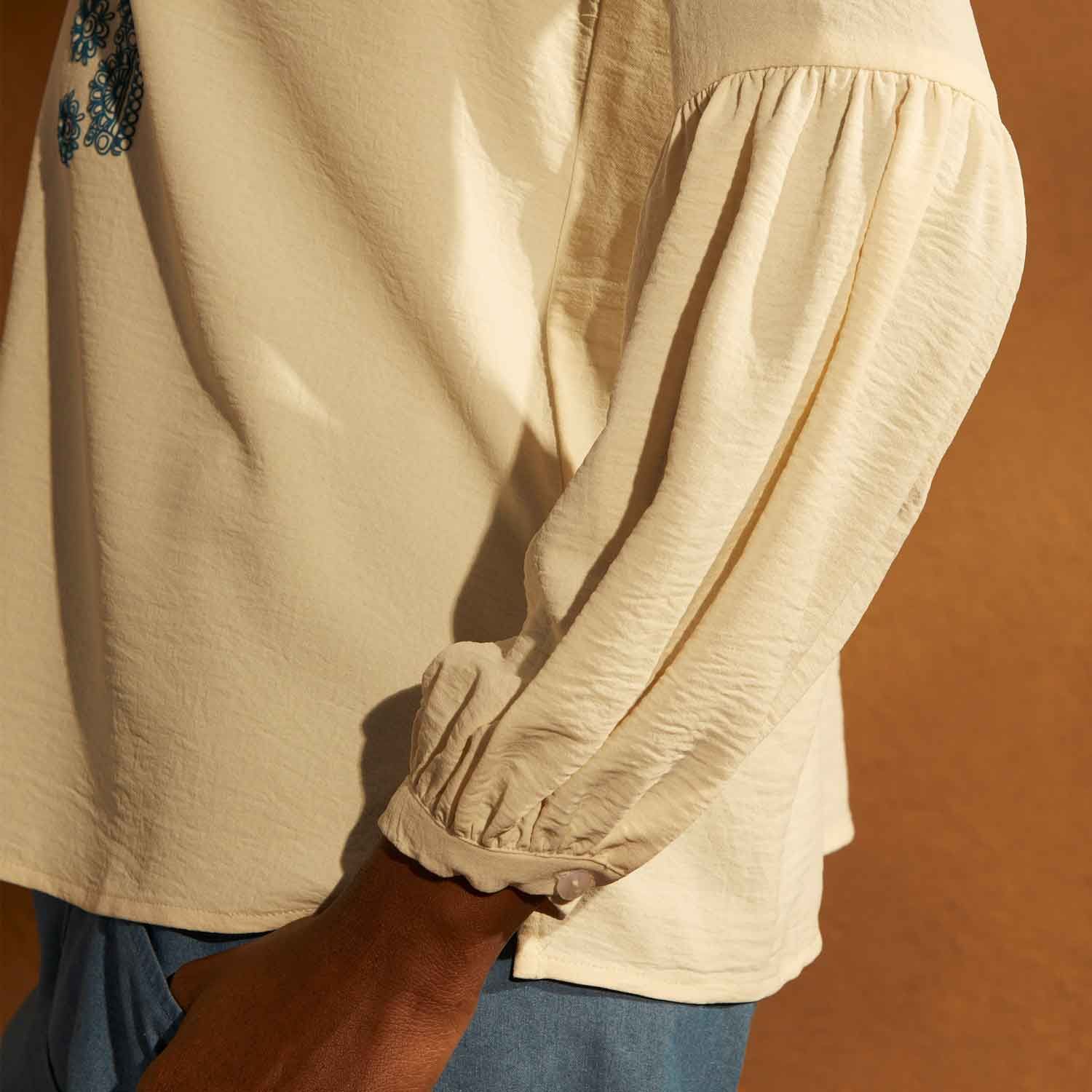 Light, breathable and effortlessly boho-chic, this top is perfect for warm, sunny days. An ivory blouse showcases an intricate blue print, long sleeves with button cuffs and a tie-front with tassels for a touch of wanderlust flair. 22" on M; 24" on 1X. Machine wash, line dry. Imported.