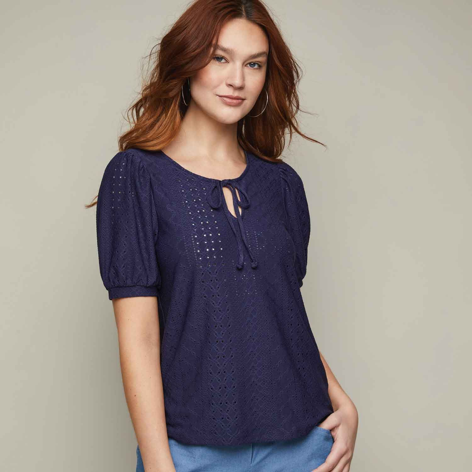 Eye-catching eyelet, puff sleeves and a front tie neckline turn this navy top into an elevated essential. A charming style that can easily be dressed up or down, just choose your shoes to match. Center back length: 23 ½" on M; 25" on 1X. Imported.