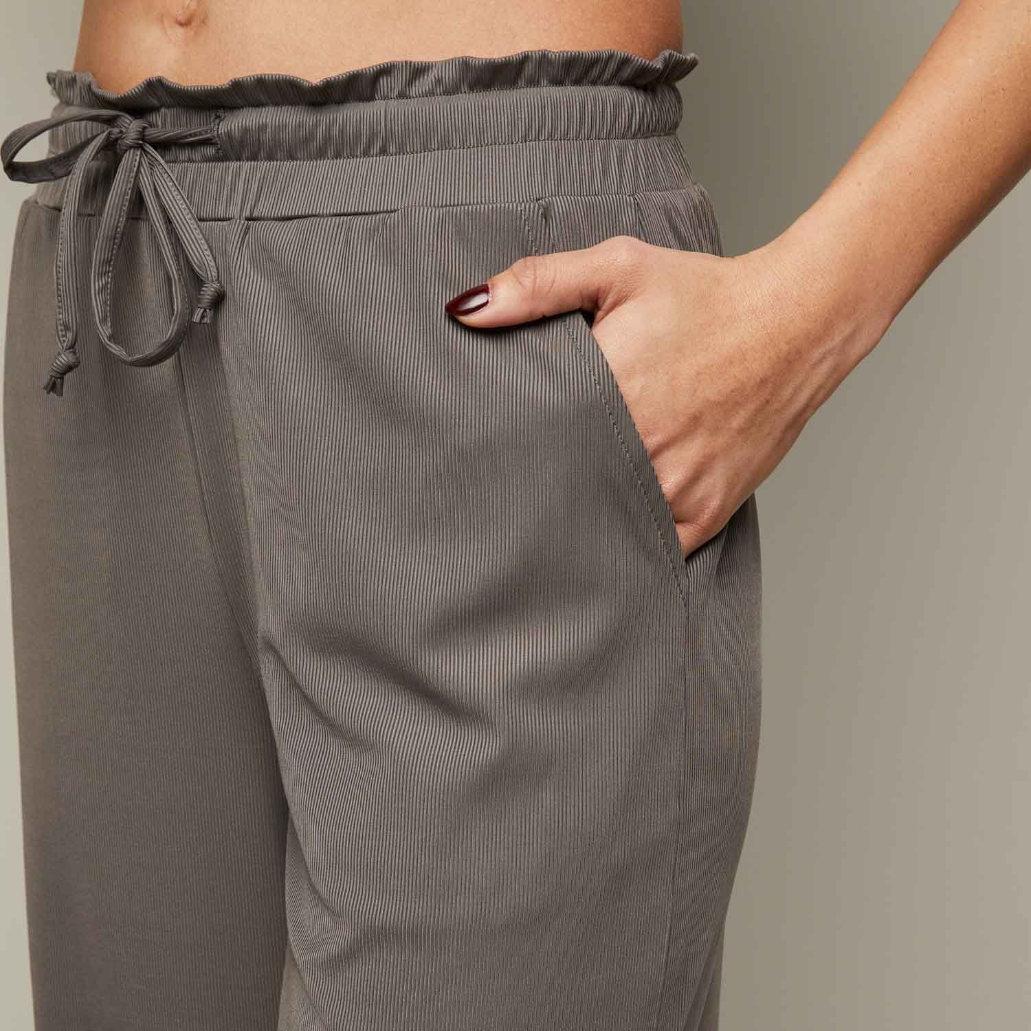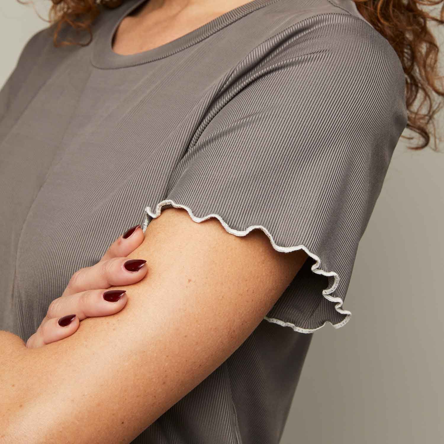 Unwind in style with this ultra-comfy set featuring a relaxed fit and contrasting ivory scallop trim. The matching pants have handy side-seam pockets and an elastic waist. Center back length: 26" on M; 27 ½" on 1X. Inseam: 28 ½" on all sizes. Imported.