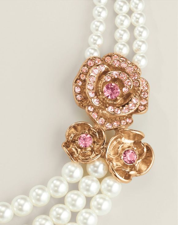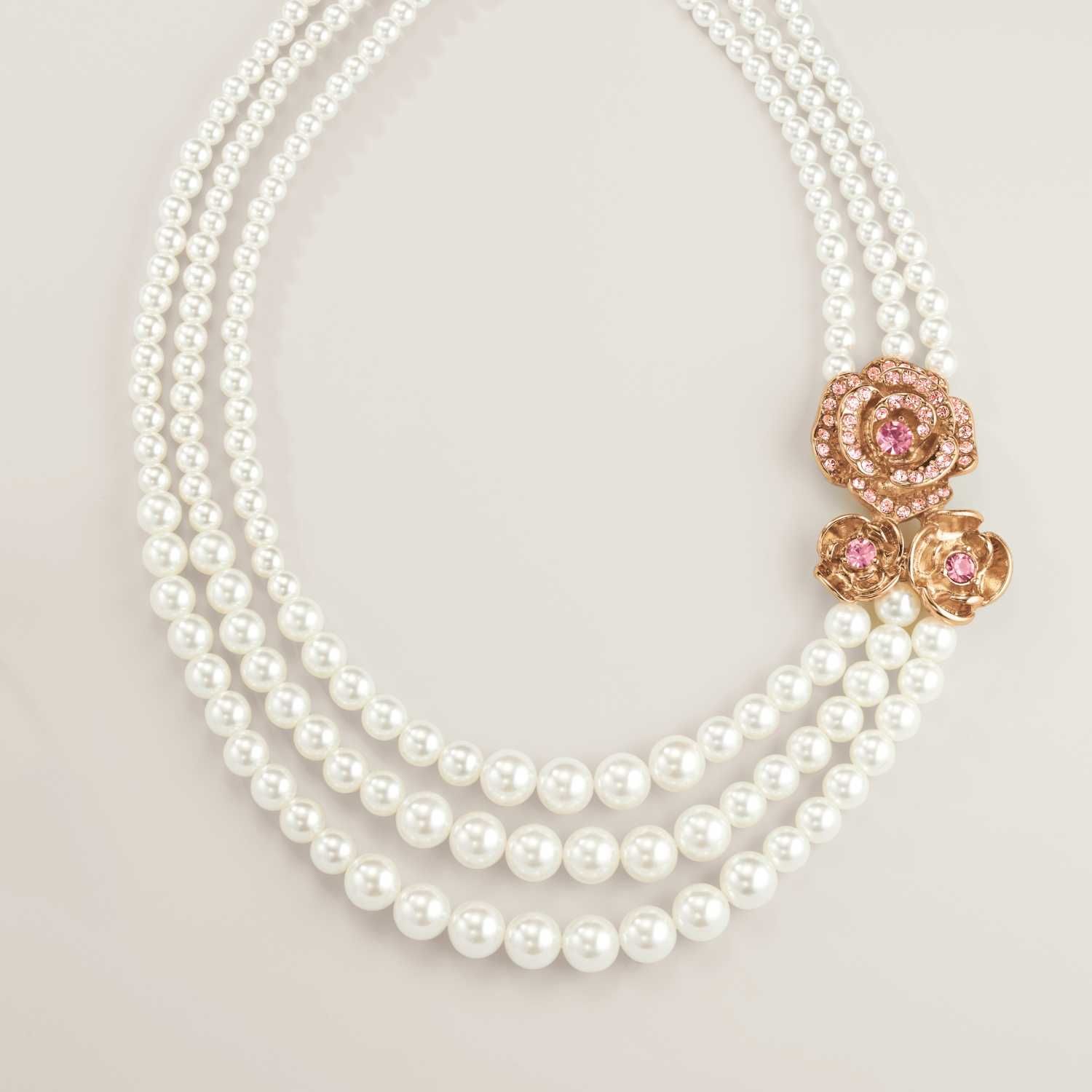 Everything’s coming up roses. Layers of pearly beads and sparkling goldtone rose motifs are beautifully displayed in a glam three-row necklace fit for special occasions.