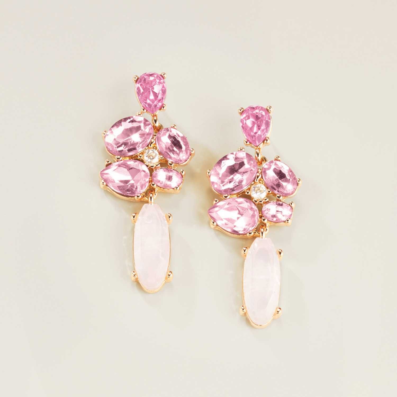 Shimmering stones in shades of blue or rose form a pretty floral design. Highlighted by an accent stone drop, this pair instantly adds sparkle to any outfit. Matching necklace and earring set also available.