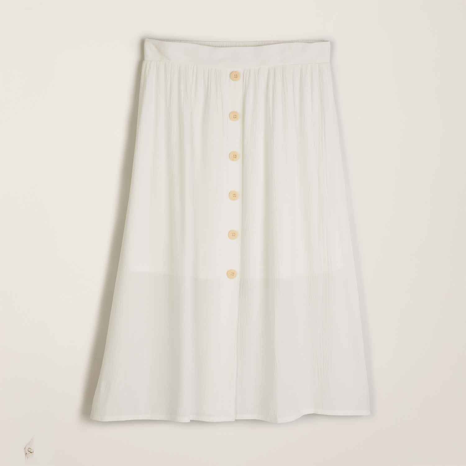Designed to be the perfect partner for warm-weather days, this breezy midi skirt has a flat-front waistband and an elastic back for a comfortable fit. Tailored from versatile white crepe, it’s accented with faux wood decorative buttons, adding a touch of natural flair. Calf-length; lined through the knee. Center back length: 28" on M; 29" on 1X. Imported.