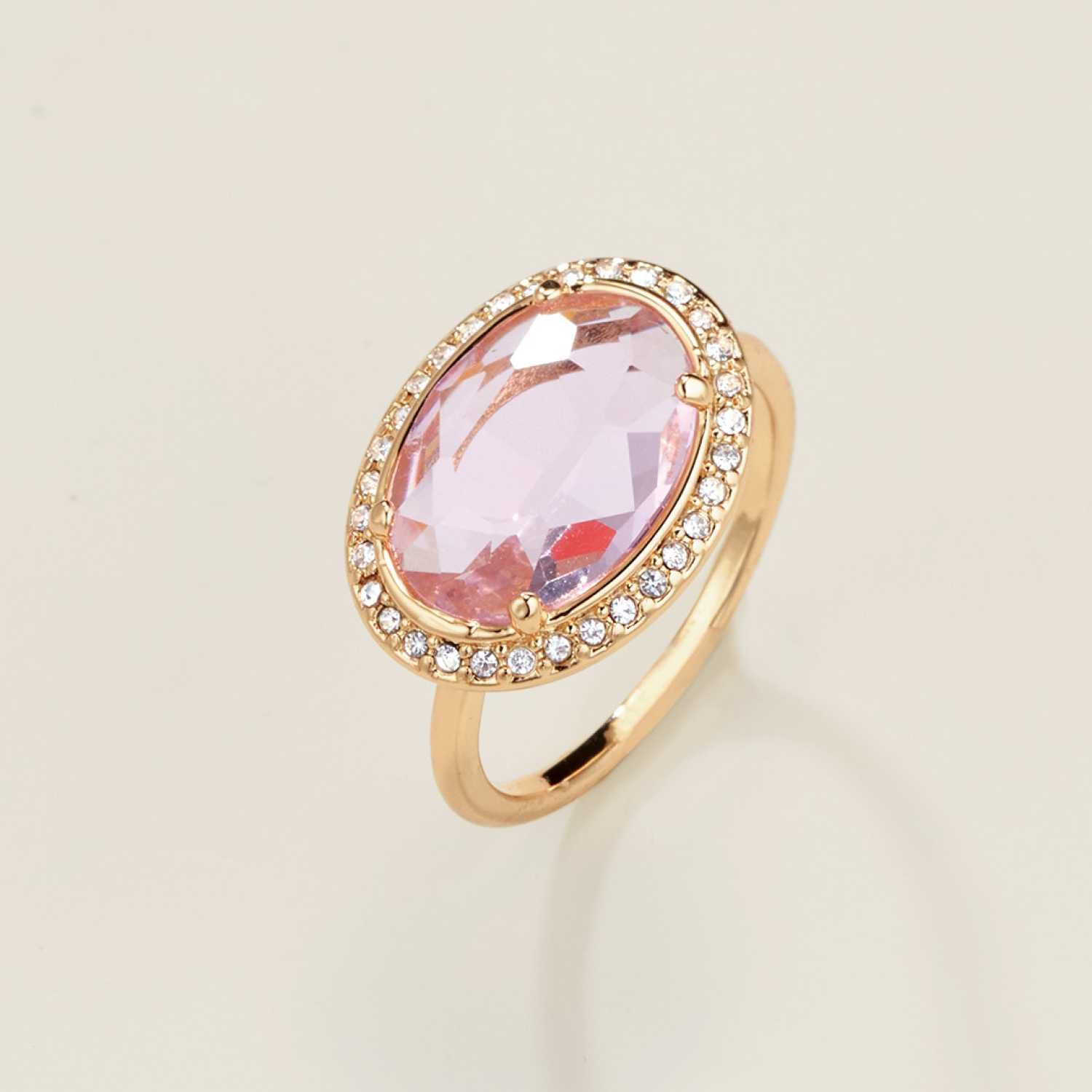 • Faceted jewel-like stone with crystal halo setting