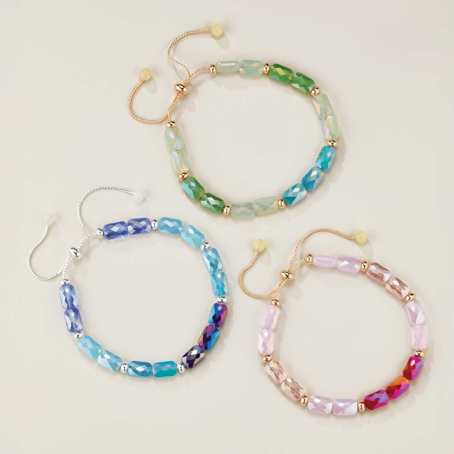 Looking to add an extra pop of color to your look? This adjustable bracelet is adorned with multicolored faceted jewel-like beads for added charm. Available in three colors: red/goldtone, blue/silvertone and green goldtone. Matching watch and necklace also available.