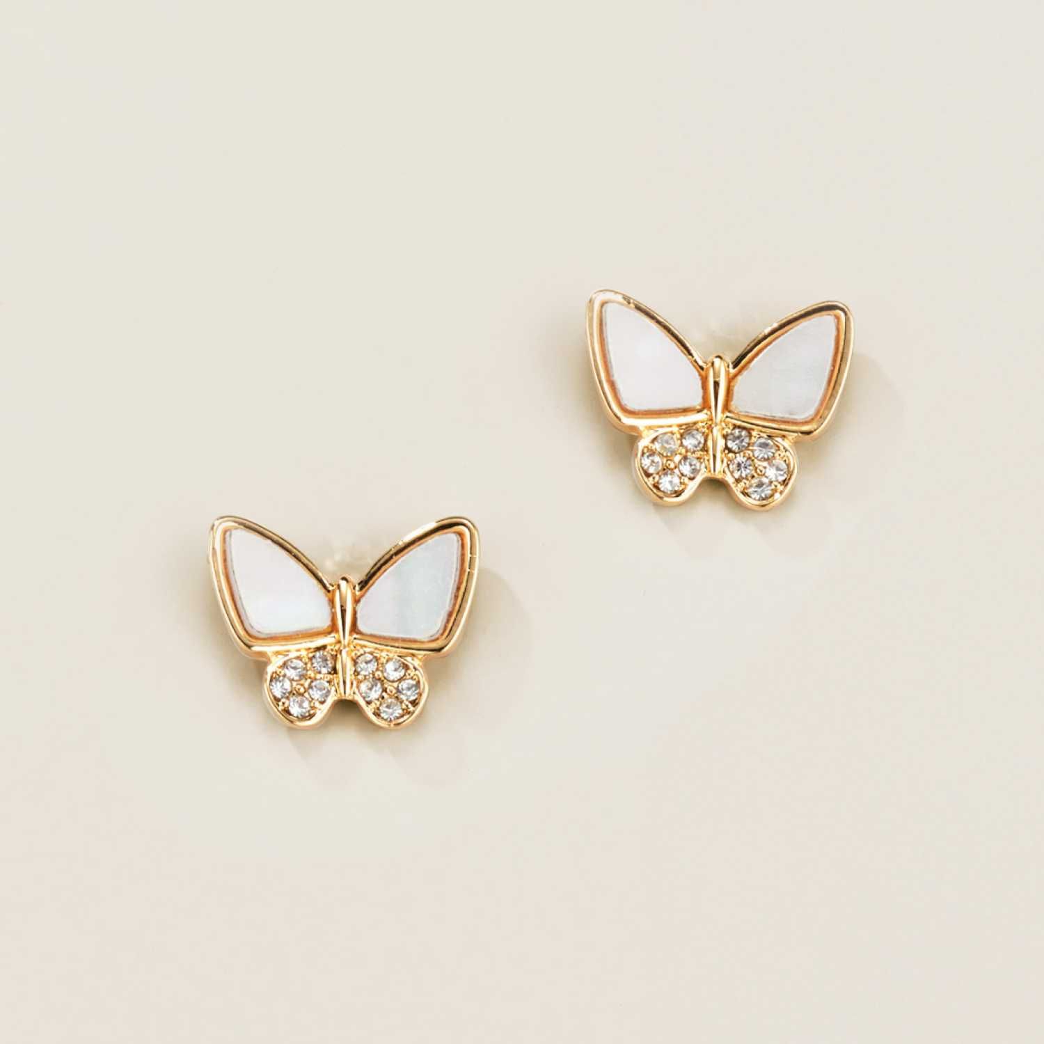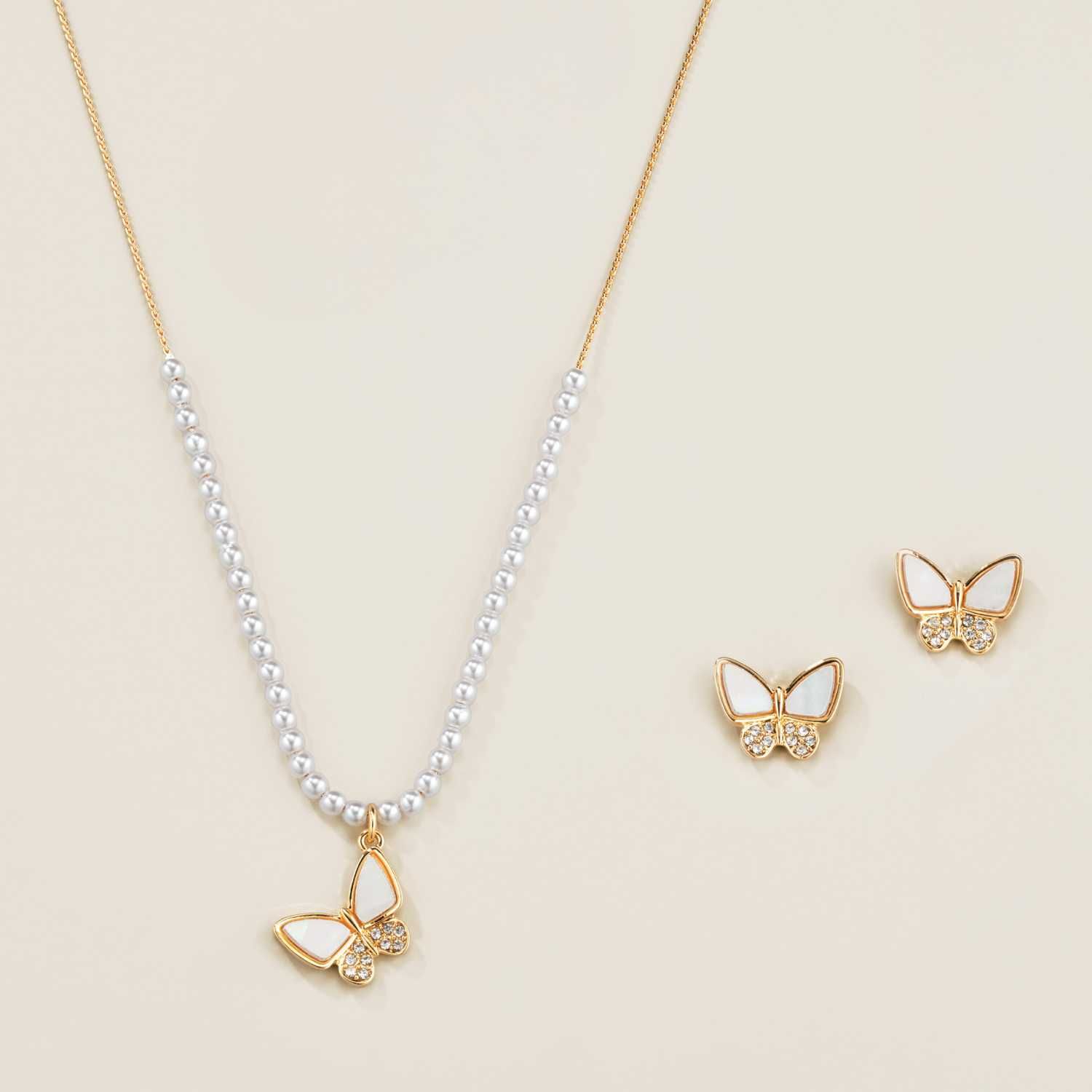 Discover classic refinement with this butterfly-inspired jewelry set, blending delicate detailing with a touch of femininity. Featuring shell accents in a butterfly design, the necklace chain is adorned with lustrous pearly beads while the stud earrings sparkle with crystal dots for a subtly elegant finish.