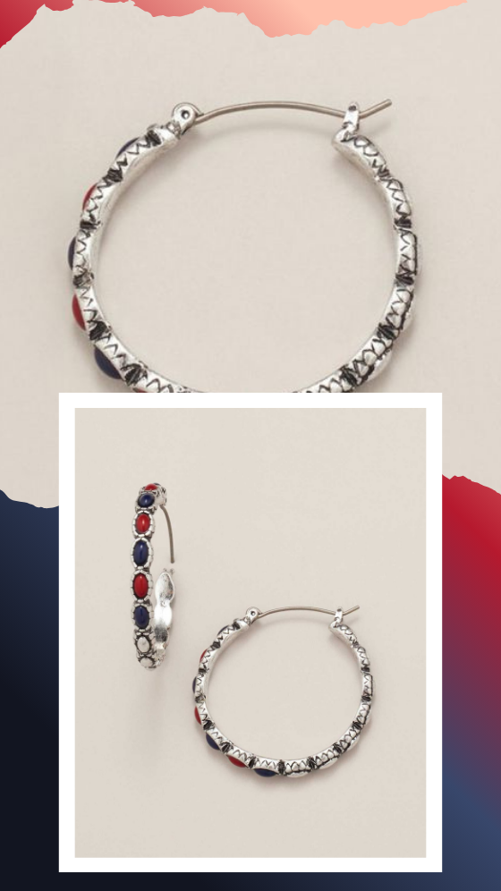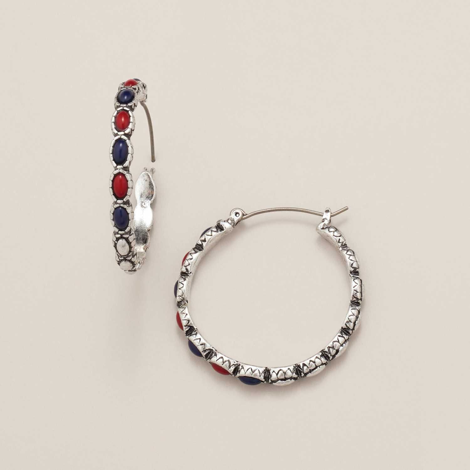 Add a simple touch of Americana flair to your ensemble with the perfect accessory. Antiqued silvertone hoops are embellished with red and blue jewel-like stones.