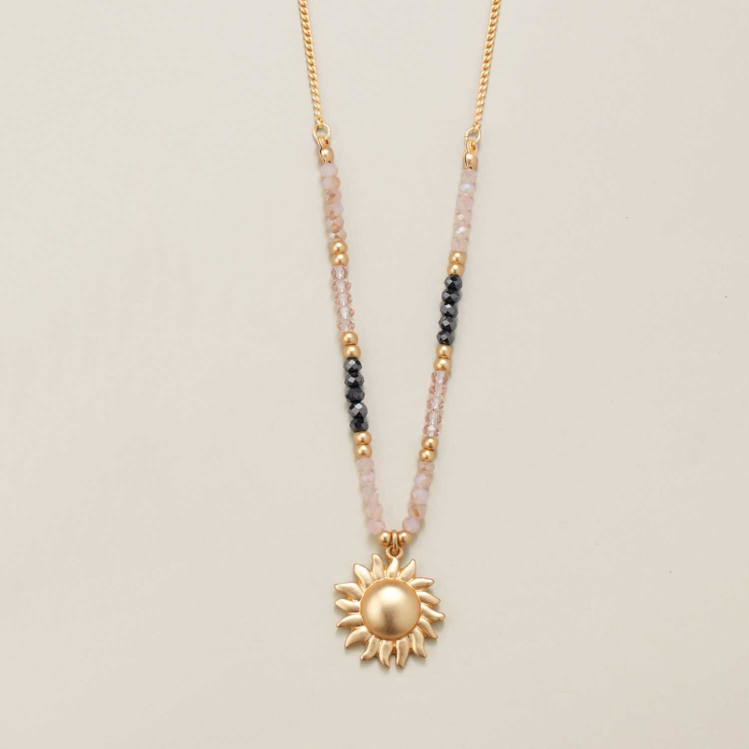 Illuminate your day with a ray of sunshine. A goldtone sun-shaped pendant hangs from a delicate chain adorned with blush pink and black glass beads.