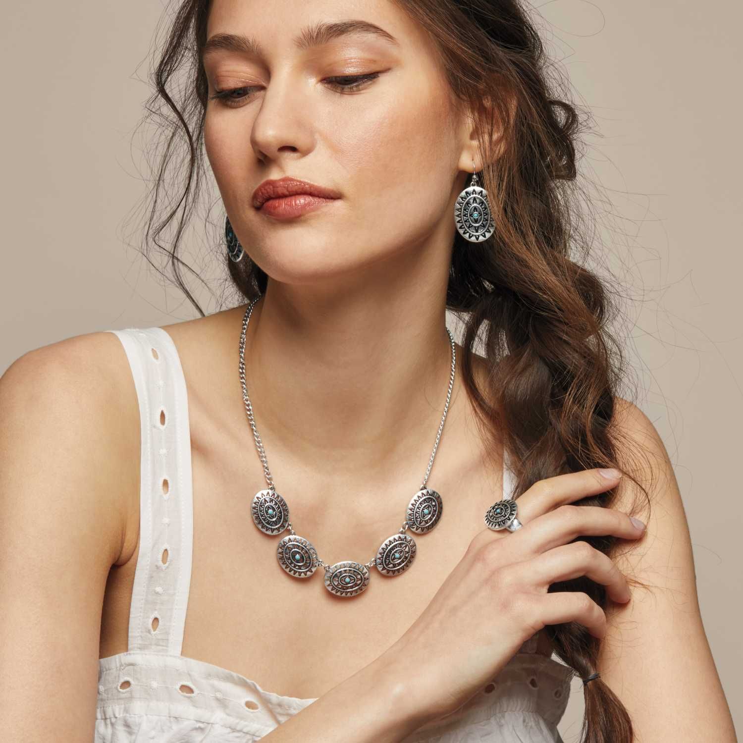 Featuring textured antiqued silvertone and turquoise-colored accent stones, this bold set brings rustic elegance to any look.