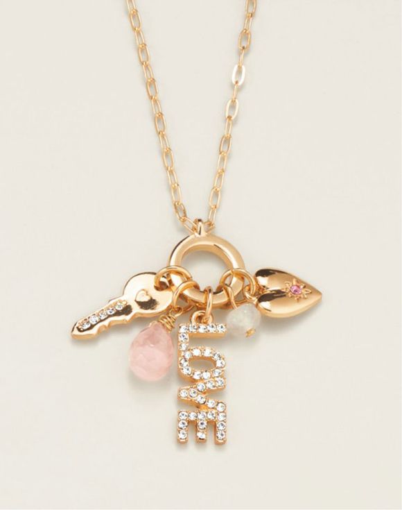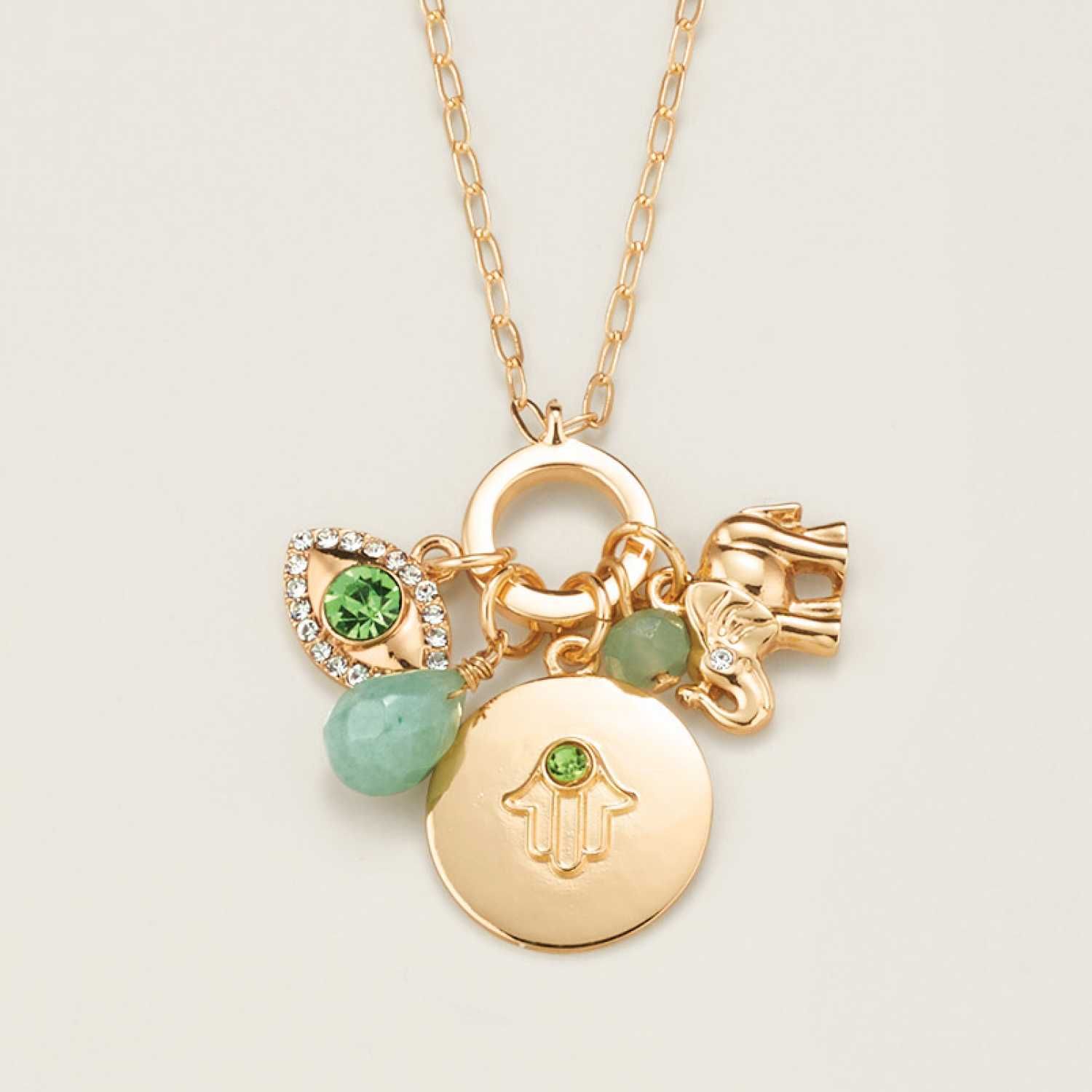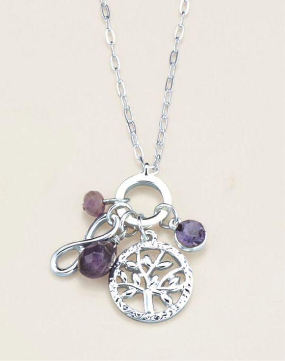 Set the pace for the day with a necklace featuring positive mementos for an extra touch of sparkle and good vibes. Available in three styles: luck/green/goldtone, family/purple/silvertone and love/pink/goldtone.