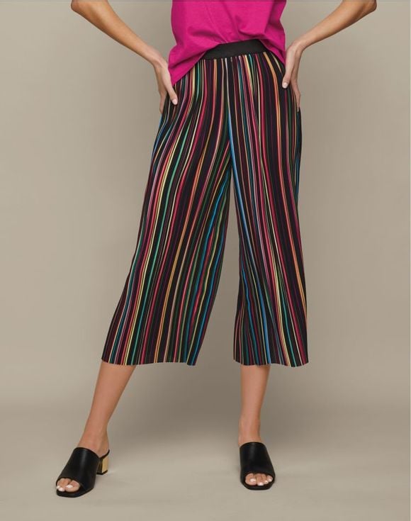 Cropped, striped and totally cool. Black and multicolor stripe pants with a pleated texture for a touch of interest. The wide-leg silhouette, elastic waistband and easy pull-on styling ensure a comfortable fit. Inseam: 23" on all sizes. Imported.