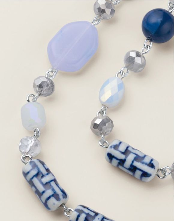 A medley of sky-blue hues is featured on a serenely beautiful statement necklace. Jewel-like glass beads varying from light to dark blue are set in a lustrous silvertone setting.