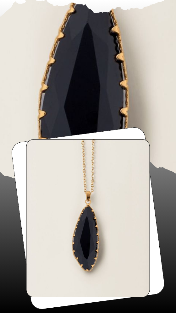 Complete your look with a hint of glamour. A sleek black glass pendant, shaped like a delicate leaf, hangs from a refined goldtone chain for a striking contrast that turns heads day or night.
