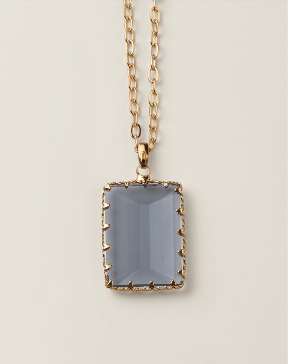 Modern edge meets understated glam. A faceted grey-blue crystal-like pendant is suspended from a sleek goldtone chain, adding a cool, effortless vibe to your style. Layer it or let it shine solo.