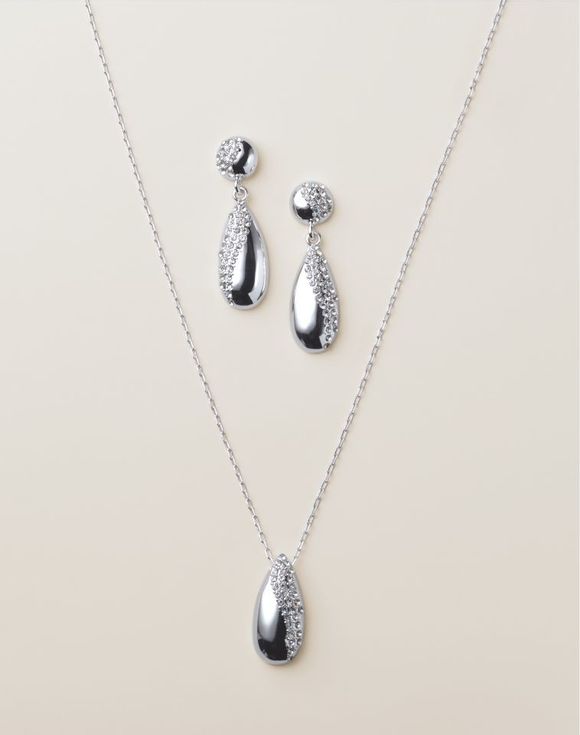 Shimmer with elegance. Sparkling pavé stones enhance silvertone teardrop pendants in this classic set that’s perfect for dressing up your day or adding the final touch to your night out.