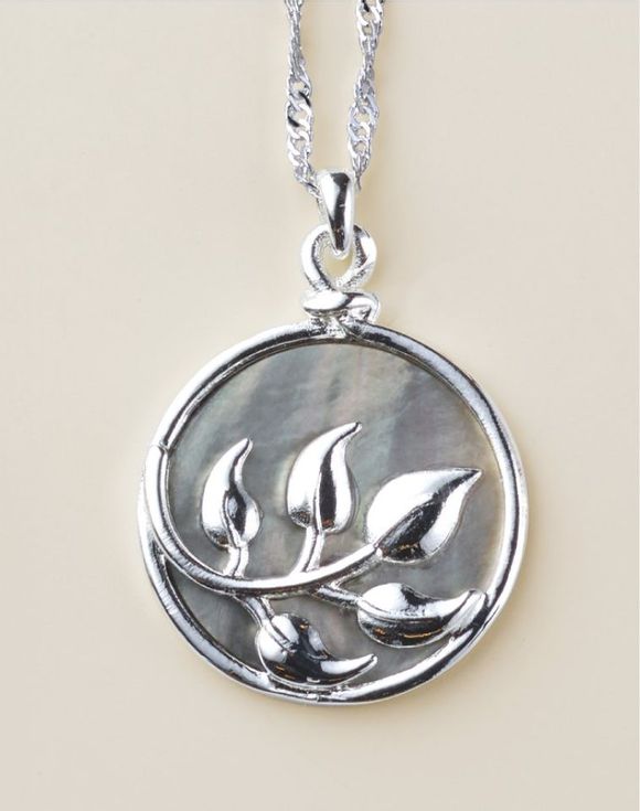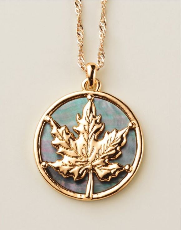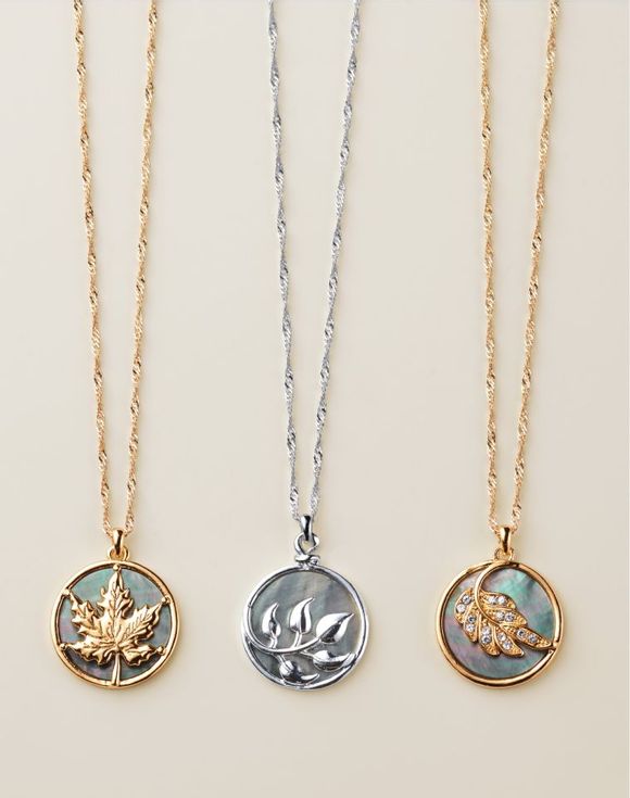 Embrace the simplistic simple beauty of nature. Lustrous mother-of-pearl pendants are adorned with gilded leaves and hang from a modern chain. Available in three styles: maple leaf/goldtone, branch/silvertone and petal/goldtone.