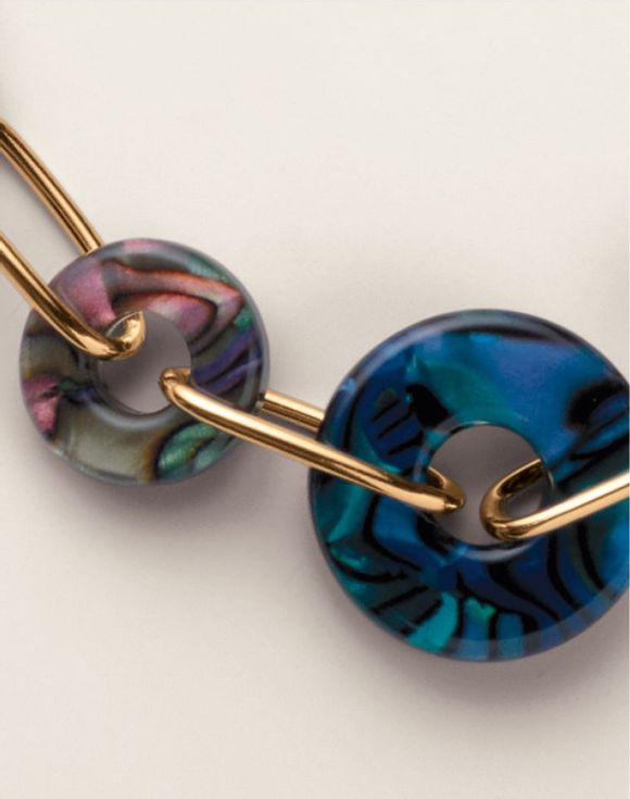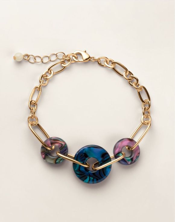 Incorporating the look of abalone to your jewelry wardrobe is a unique way to embrace seaside splendor. Goldtone links are adorned with a trio of abalone-like discs featuring an iridescent shimmer.
