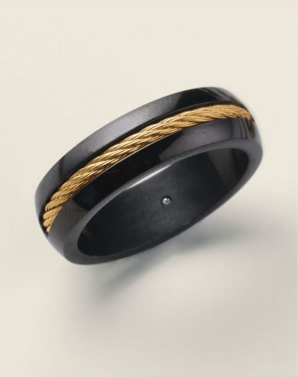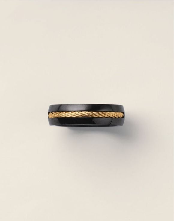 Rugged texture meets lasting shine in this sophisticated ring. Crafted in sleek black stainless steel, a goldtone rope-like accent adds distinctive edge.