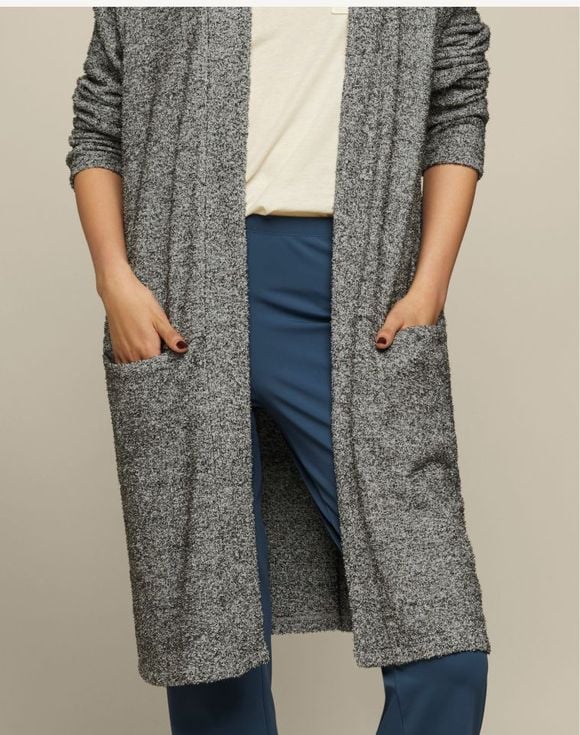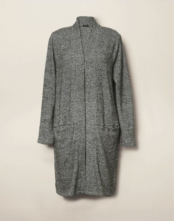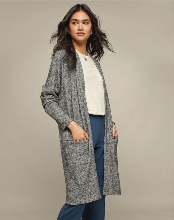 A longline design that drapes effortlessly, perfect for layering over everything from jeans and tees to office-ready ensembles. A smoke gray soft marled knit, this open-front cardigan is equipped with two front pockets. Center back length: 36" on M; 37" on 1X. Imported.