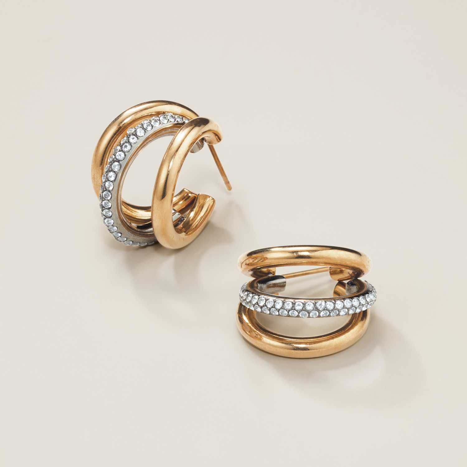 Make a lasting impression with a winning combo of metals. Small hoop earrings are layered with CZ-accented stainless steel and gold-plated accents built for long-lasting wear. Matching bracelet and ring also available.