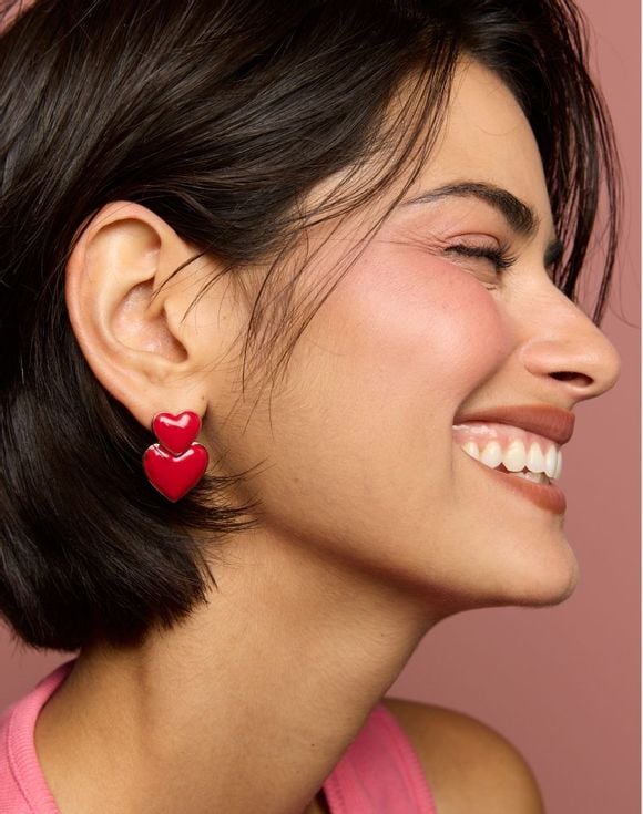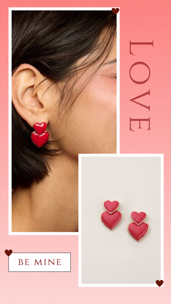 Double down on love this sweetheart season with these stacked heart earrings. A duo of red enamel hearts in varying sizes with goldtone outline brings sparkling romance. Imported.
