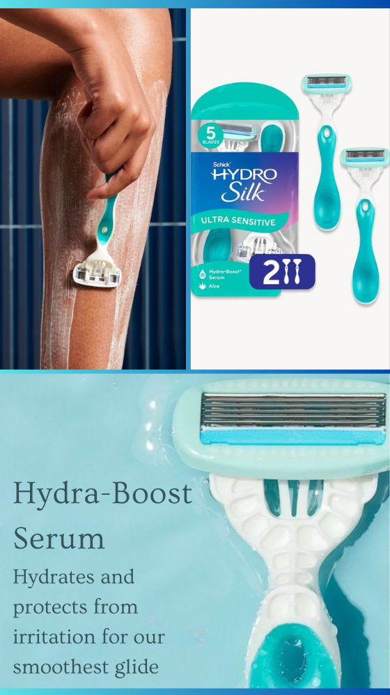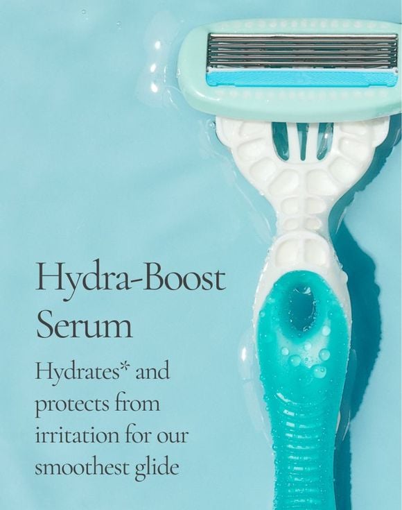 • Hydra-Boost Serum + Aloe: Smooth-gliding, razor for women that provides moisture for up to 2 hours after shaving for touchably soft skin.