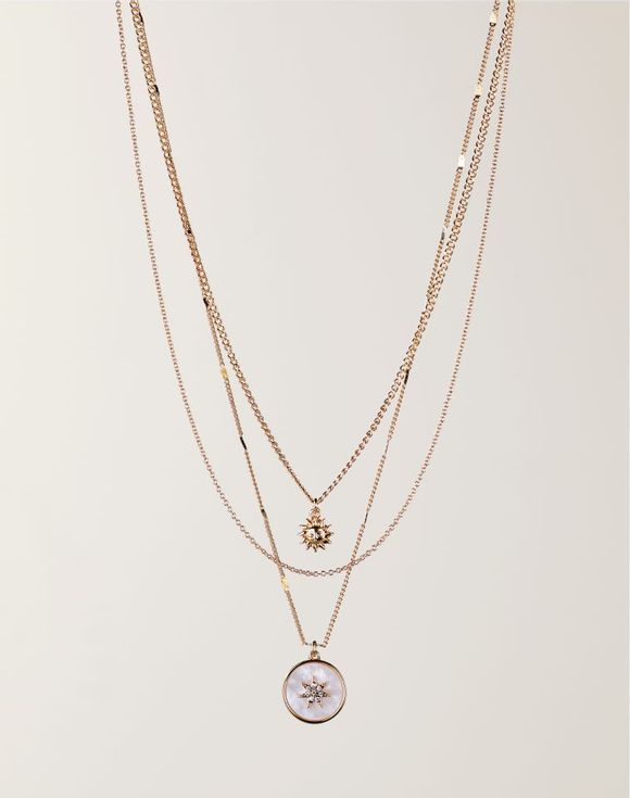 Who can resist out-of-this world style? This three-row overlapping necklace is accented with a shining sun charm and sparkling star pendant with luminous mother-of-pearl stone accents.