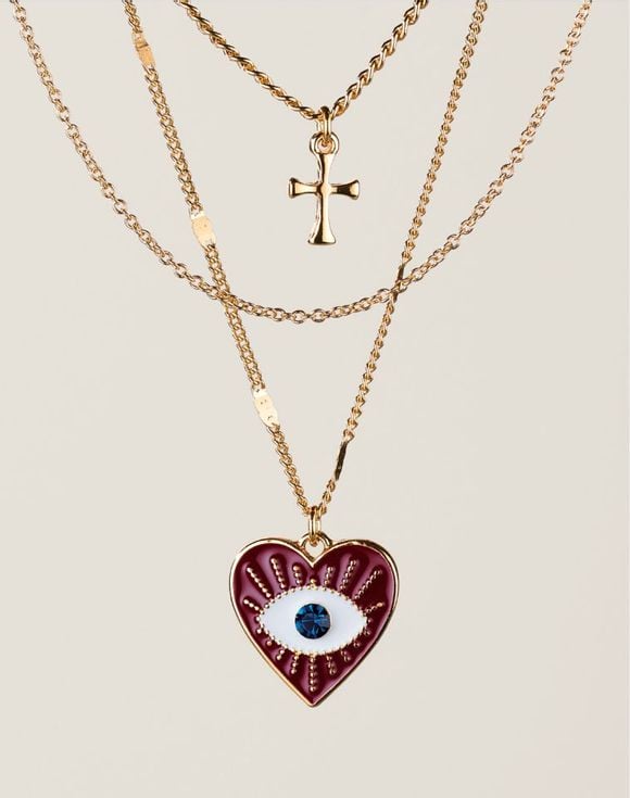 Simple, stunning and straight from the heart. This three-row overlapping necklace is accented with a cross charm and heart and eye pendant with sparkling stone accents on enamel.