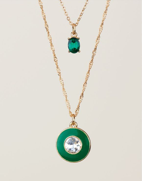 A little luck, a lot of style. This three-row overlapping necklace is accented with enchanting green symbols including a faux emerald and sparkling stone accents.