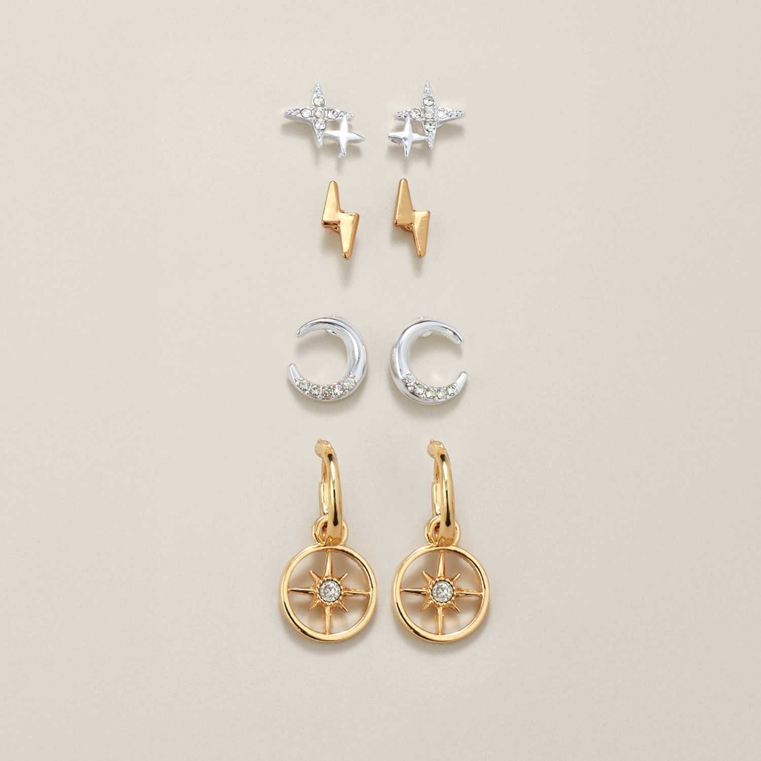 The perfect set of everyday accessories to showcase your love for celestial beauty. An assortment of dainty goldtone and silvertone studs and hoops, including removable charms, allow you to customize your look.