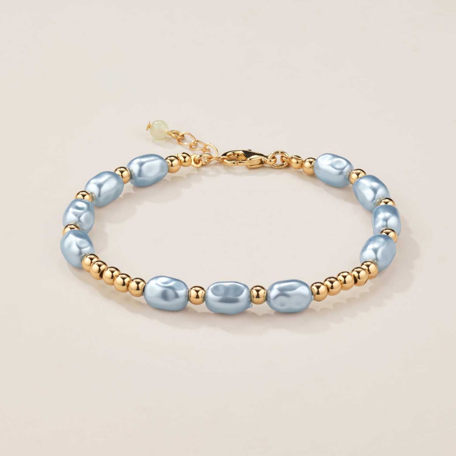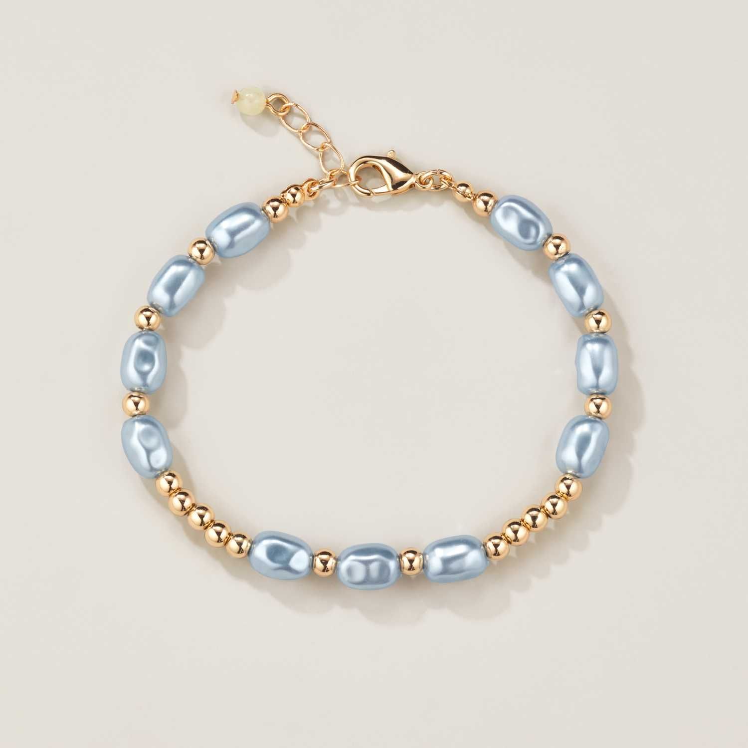 The graceful beauty of pearly blue beads paired with round gold-tone beads elevates this bracelet to new heights. The simple design and standout colors make it a perfect choice for everyday wear. Matching necklace and hoops are also available.