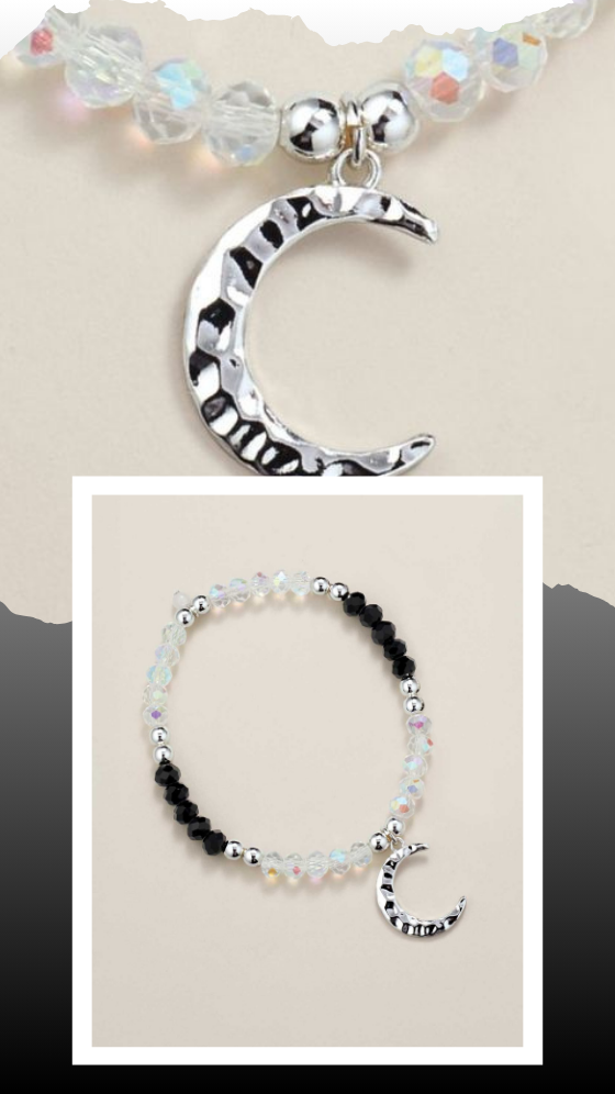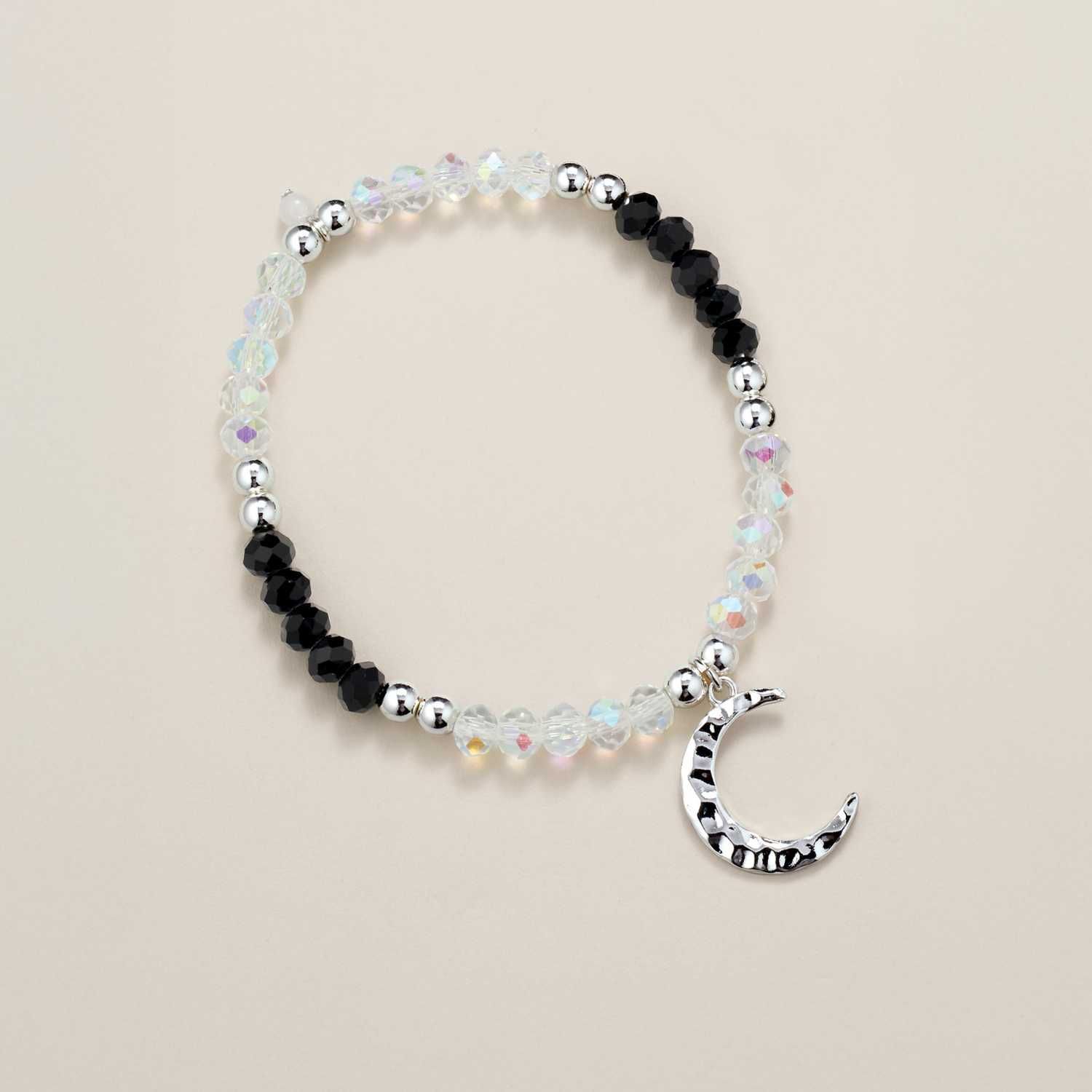 Complete your look with a touch of celestial magic. A charming silvertone crescent moon hangs from a glistening beaded bracelet composed of iridescent and black glass beads.