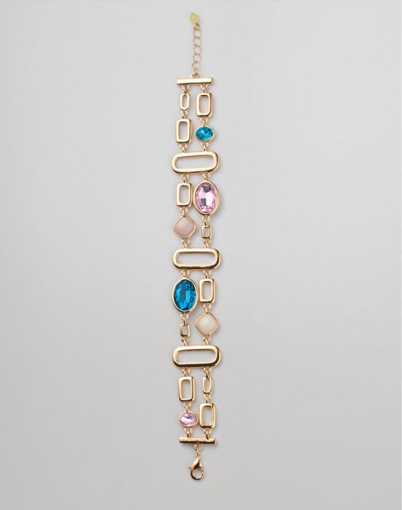 Dress up any ensemble with an eye-catching combination of shapes and colors. Geometric goldtone links and vibrant blue and rose-colored stones are artfully displayed in a cuff link bracelet. Matching necklace, ring, and earrings also available.