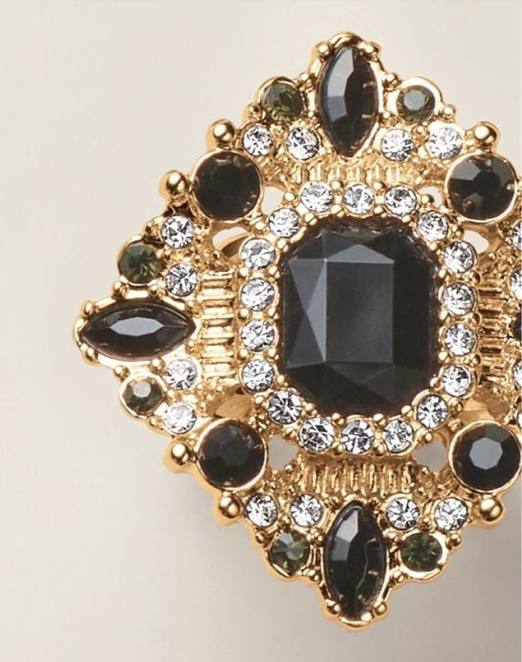 A striking statement with the look of diamonds and gold. Crafted with black and clear stone accents set in a goldtone finish, this ring captures light and detail beautifully. Its intricate design and faceted onyx-like centerpiece create a look that’s bold yet refined, perfect for adding a touch of radiance.