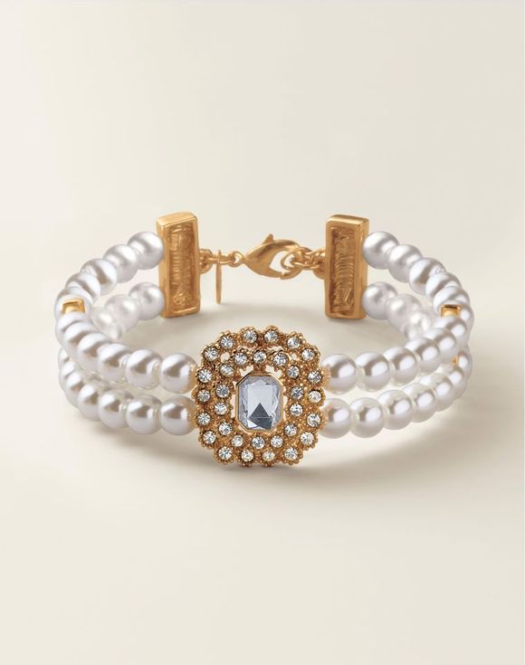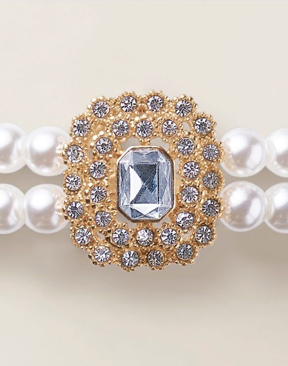 Channeling vintage elegance, this majestic accessory showcases double strands of faux pearls focusing on a diamond-like center stone surrounded by double rows of smaller clear stones in a goldtone setting. Imported.