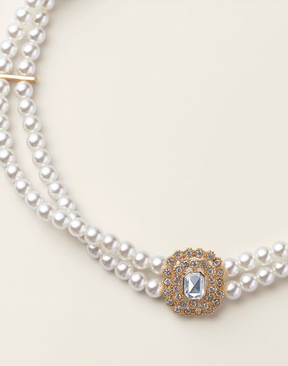 Classic pearlesque beads bloom with sweet romance in this double-strand choker necklace. This Victorian-era inspired accessory features a diamond-like center stone surrounded by double rows of clear stones in a goldtone setting.