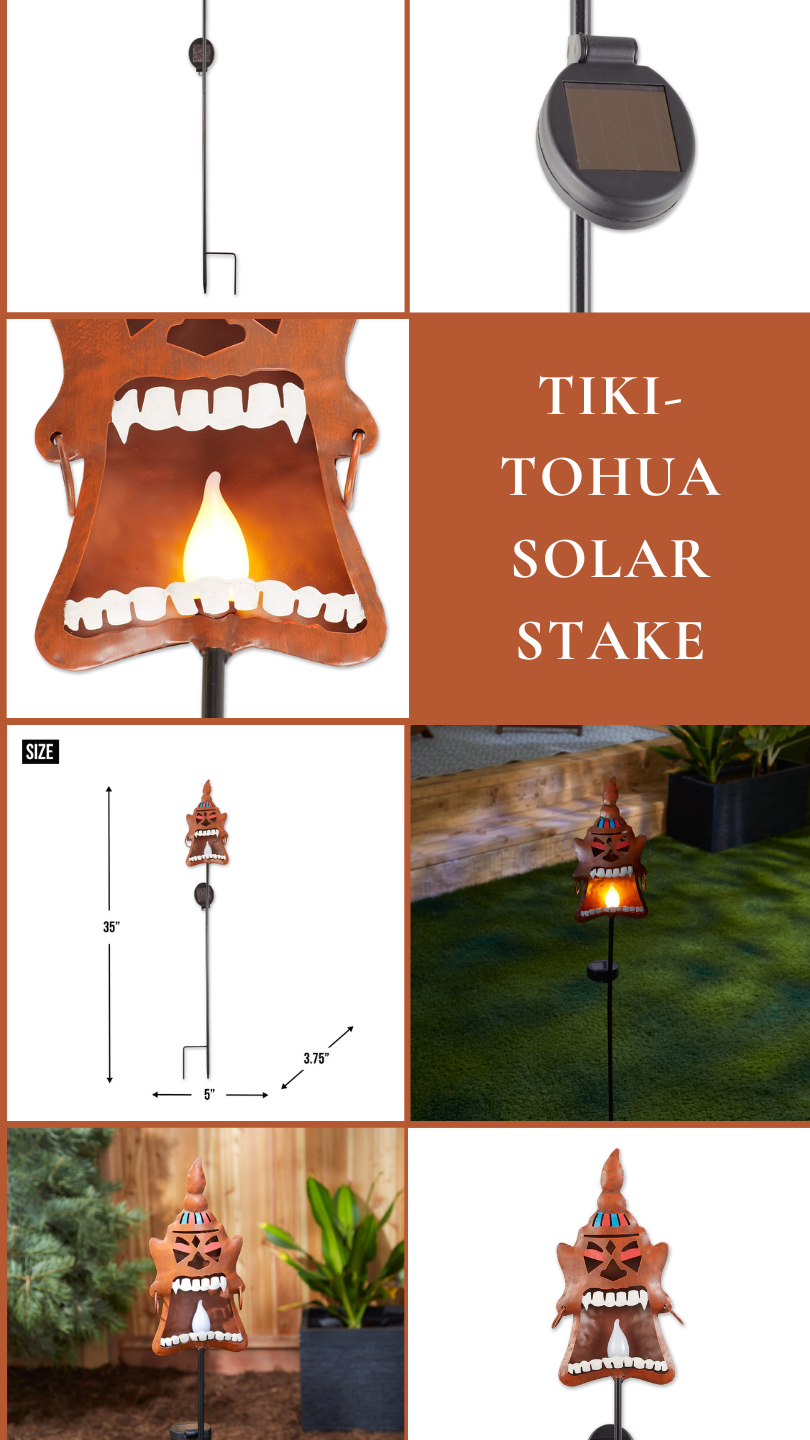 - Solar powered tiki garden stake weighs 0.66 lbs and measures 5x3.75x35"