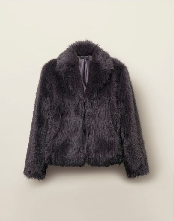 Go faux fur and full fierce. Wrap yourself in luxe warmth with this gray faux fur short jacket. Featuring an open front for easy layering, a sleek collar for modern appeal and side seam pockets to keep your essentials close. Center back length: 21 ½" on M; 24" on 1X. Imported.