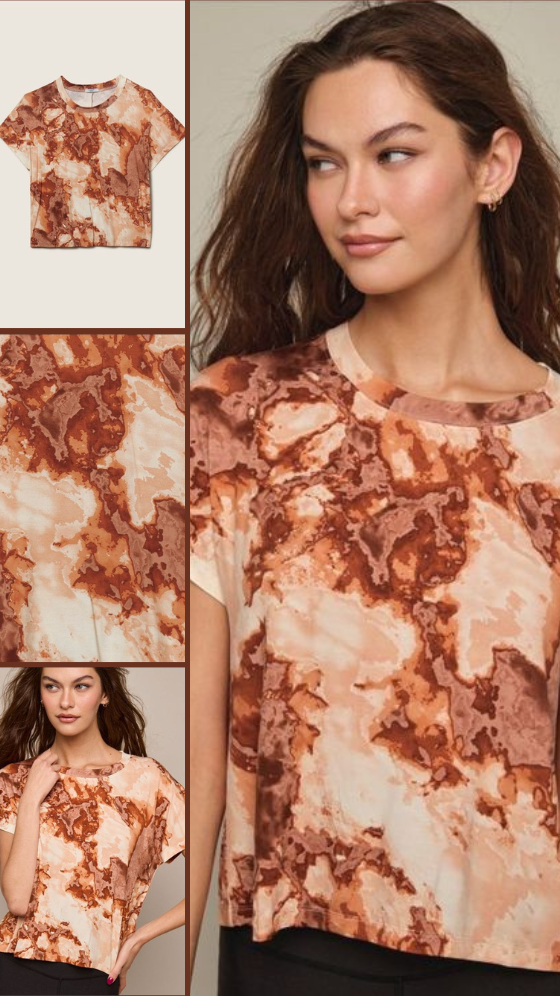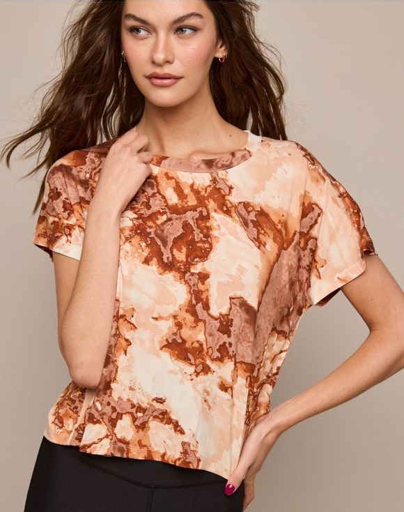 Graceful, artistic swirls add a refined touch to this timeless crewneck tee. Defined by a mocha marble-print, this soft-knit tee features a relaxed fit and a loose, flowy cut. Center back length: 21" on M; 23" on 1X. Imported.