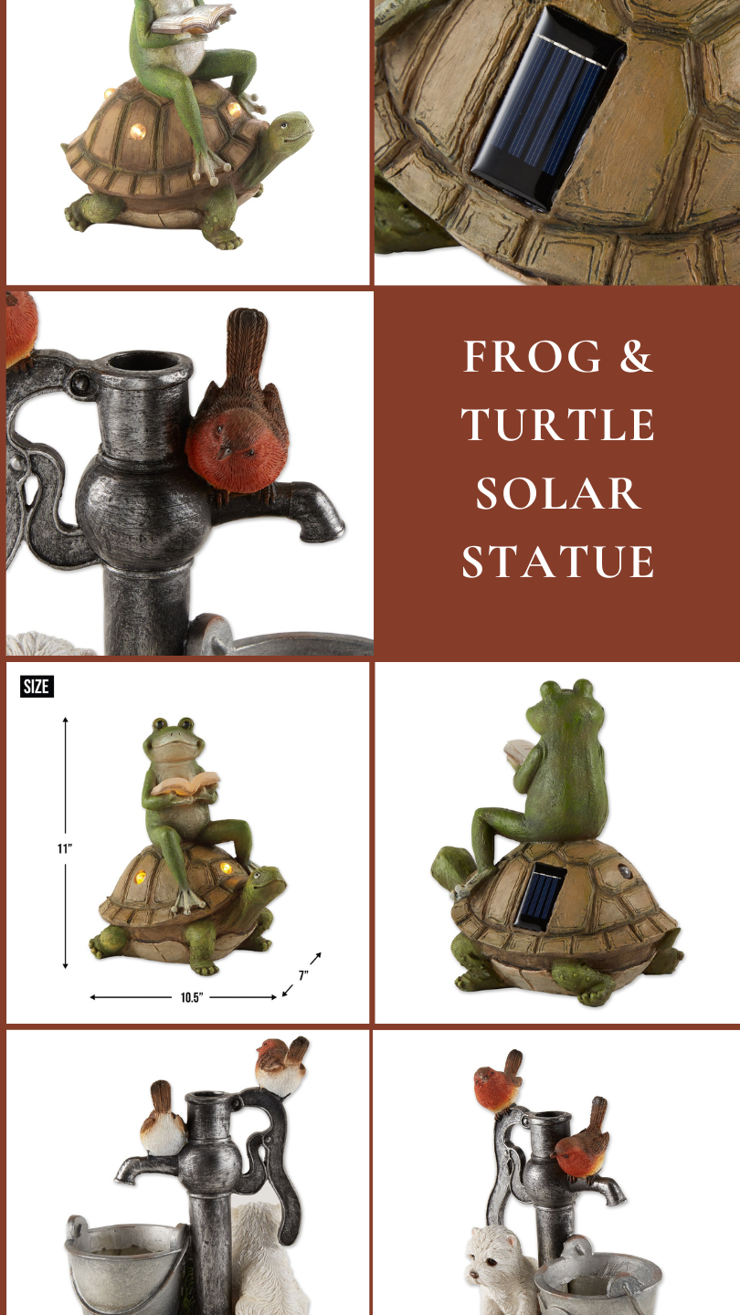 -Make your garden look like a whimsical place filled with magic and wonder with this adorable statue of a charming frog riding a turtle. This adorable solar statue is a great addition to your front walk, garden, or patio.#10018964