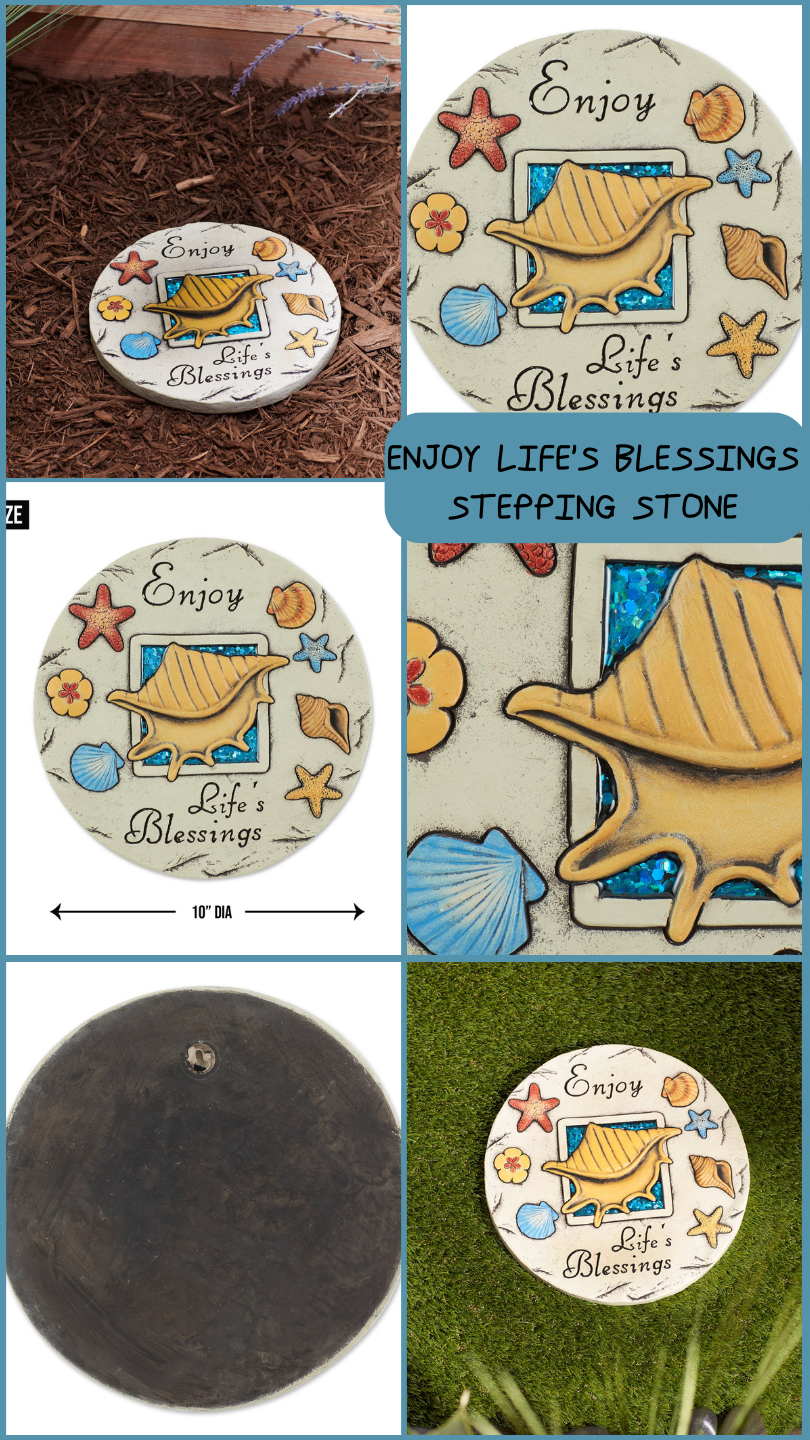 - Bring the beach home to your yard! Turn your garden into a place of gathering with this warm and inviting welcome stepping stone. The glitter overlay makes the shell pop and emits a subtle sparkle in the sunlight. #4506309