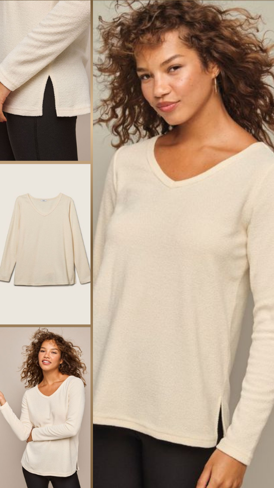 The pullover you’ll never want to take off thanks to its velvety-soft chenille fabric. This ivory knit features a V-neck, long sleeves and side slits. Center back length: 25 ½" on M; 27" on 1X. Imported.